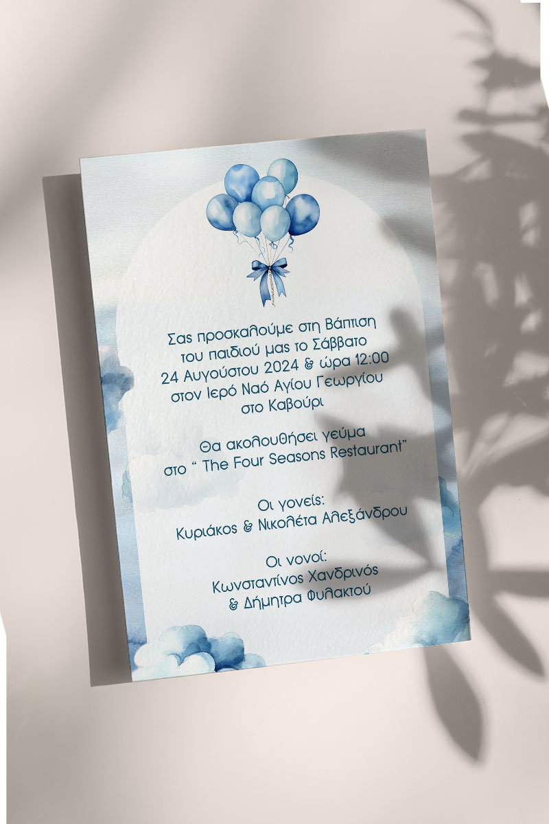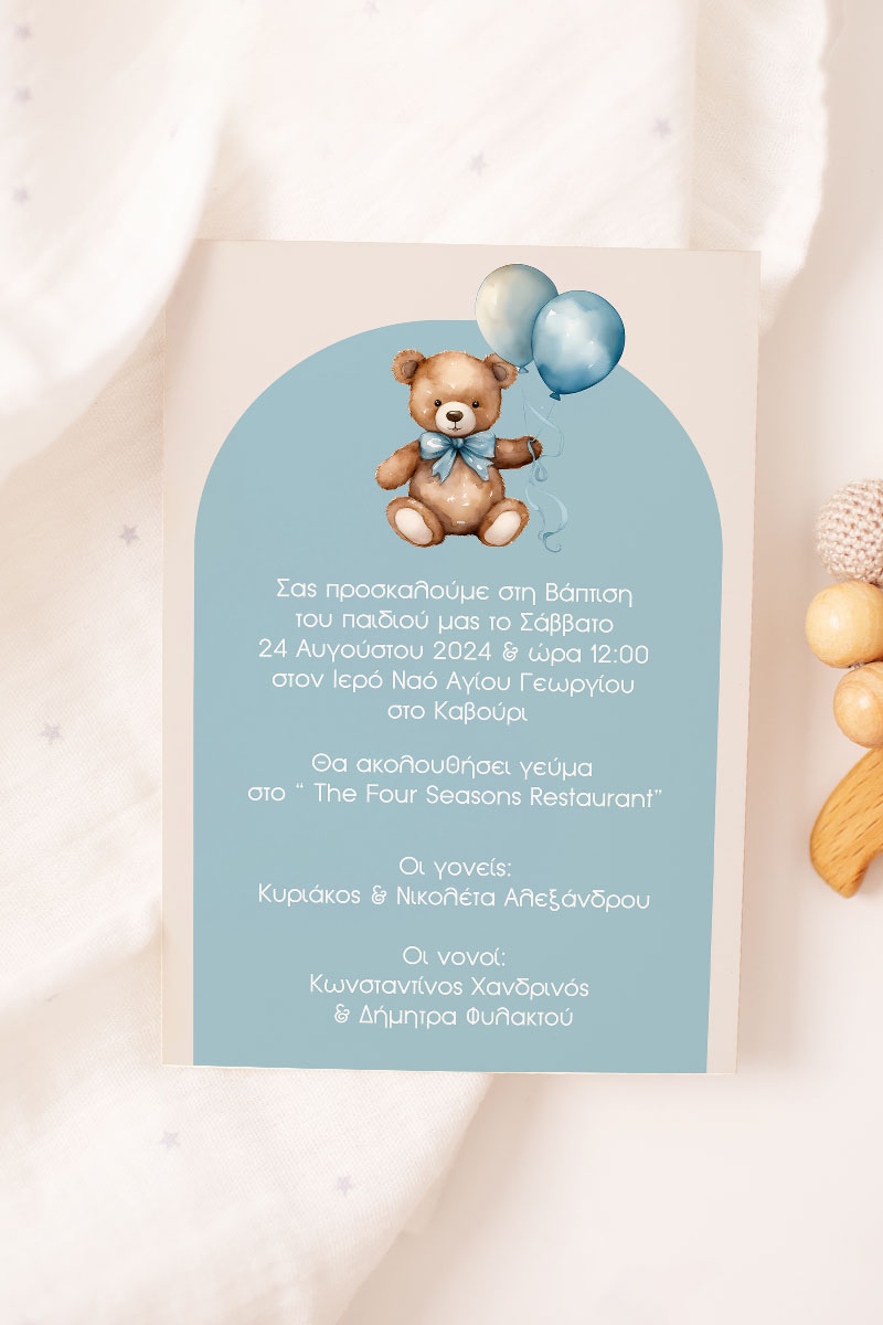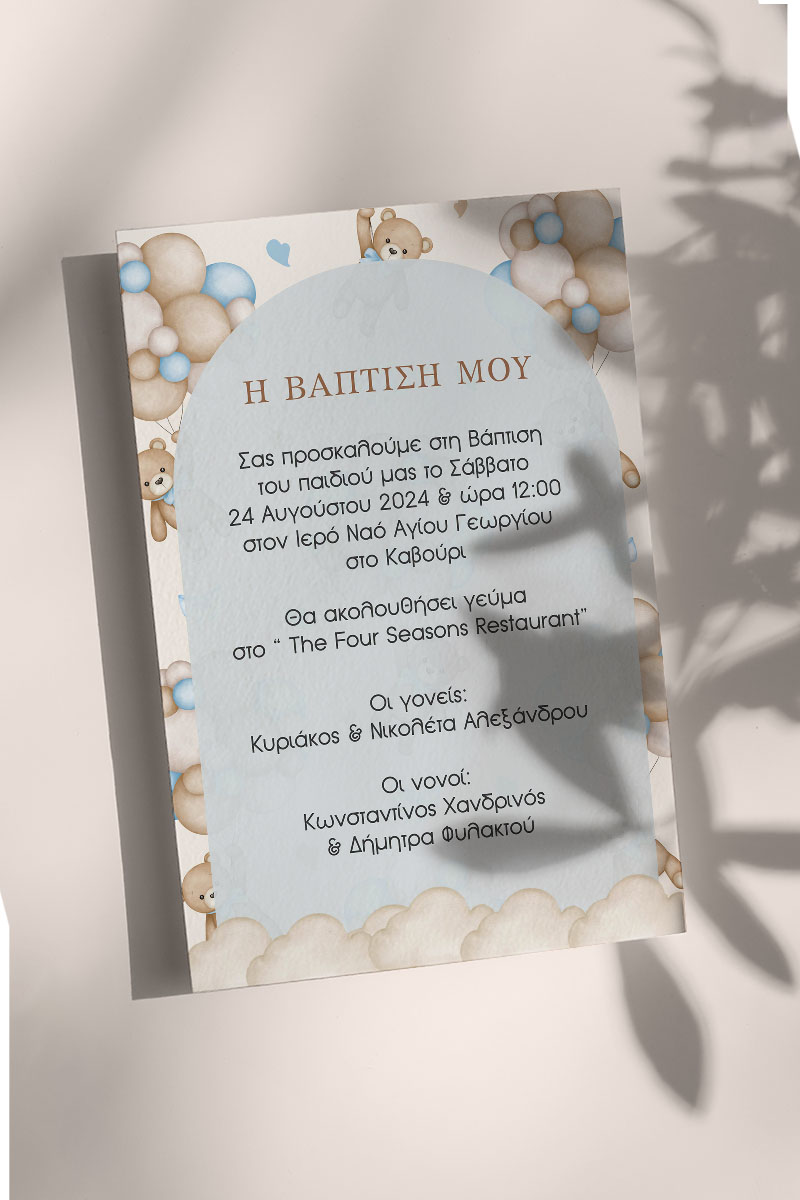 Κάθε λεπτομέρεια μετράει στην πιο όμορφη στιγμή της ζωής σας. Αυτό αντικατοπτρίζεται στα Προσκλητήρια Βάπτισης με σχέδιο Αρκουδάκι με Μπλε Μπαλόνια, τα οποία χρησιμοποιούν υψηλής ποιότητας ιταλικό χαρτί και Myikona High Definition εκτύπωση. Διαθέσιμα σε διαφορετικές διαστάσεις.