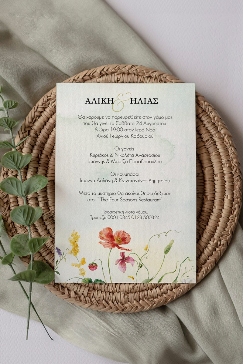 Αποκτήστε τα προσκλητήρια γάμου με σχέδιο Ανθισμένο Λιβάδι. Οι πελάτες μας τα ξεχωρίζουν για το υψηλής ποιότητας ιταλικό χαρτί και την εκτύπωση υψηλής ευκρίνειας Myikona High Definition. Διαθέσιμα σε διαφορετικές διαστάσεις.