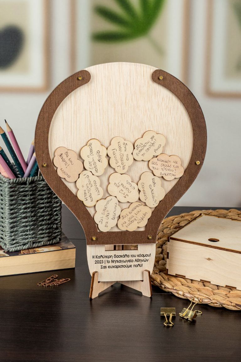 Η ξύλινη κατασκευή λειτουργεί όπως ένας “κουμπαράς ευχών”. Προσωποποιήστε το ευχολόγιο με όνομα και ευχές / τάξη / σχολείο .