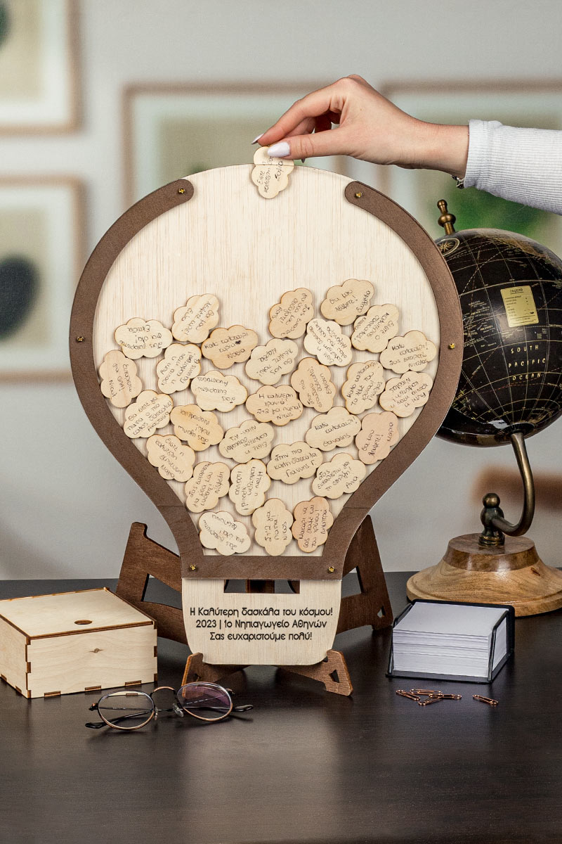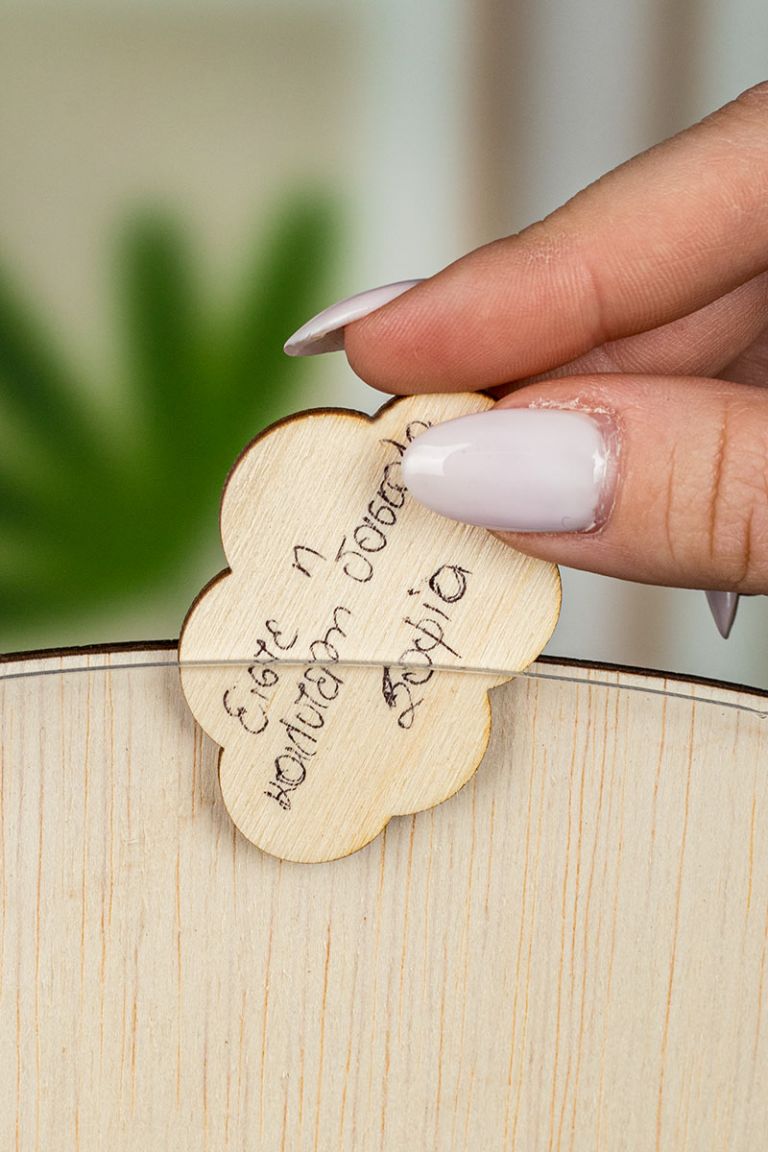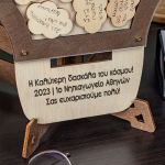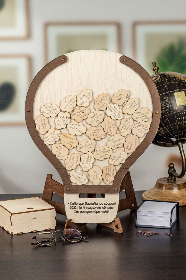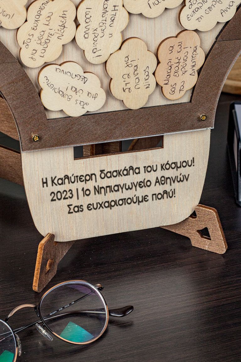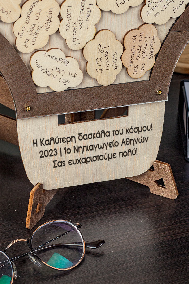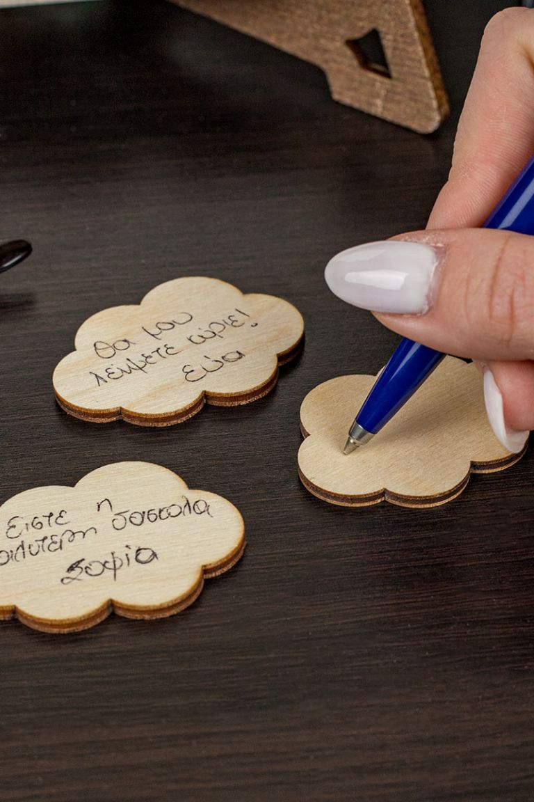 Η ξύλινη κατασκευή λειτουργεί όπως ένας “κουμπαράς ευχών”. Προσωποποιήστε το ευχολόγιο με όνομα και ευχές / τάξη / σχολείο .