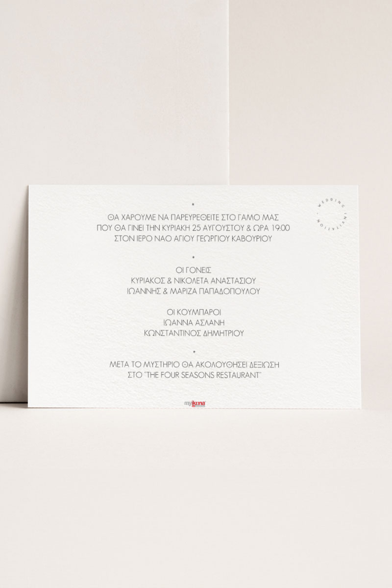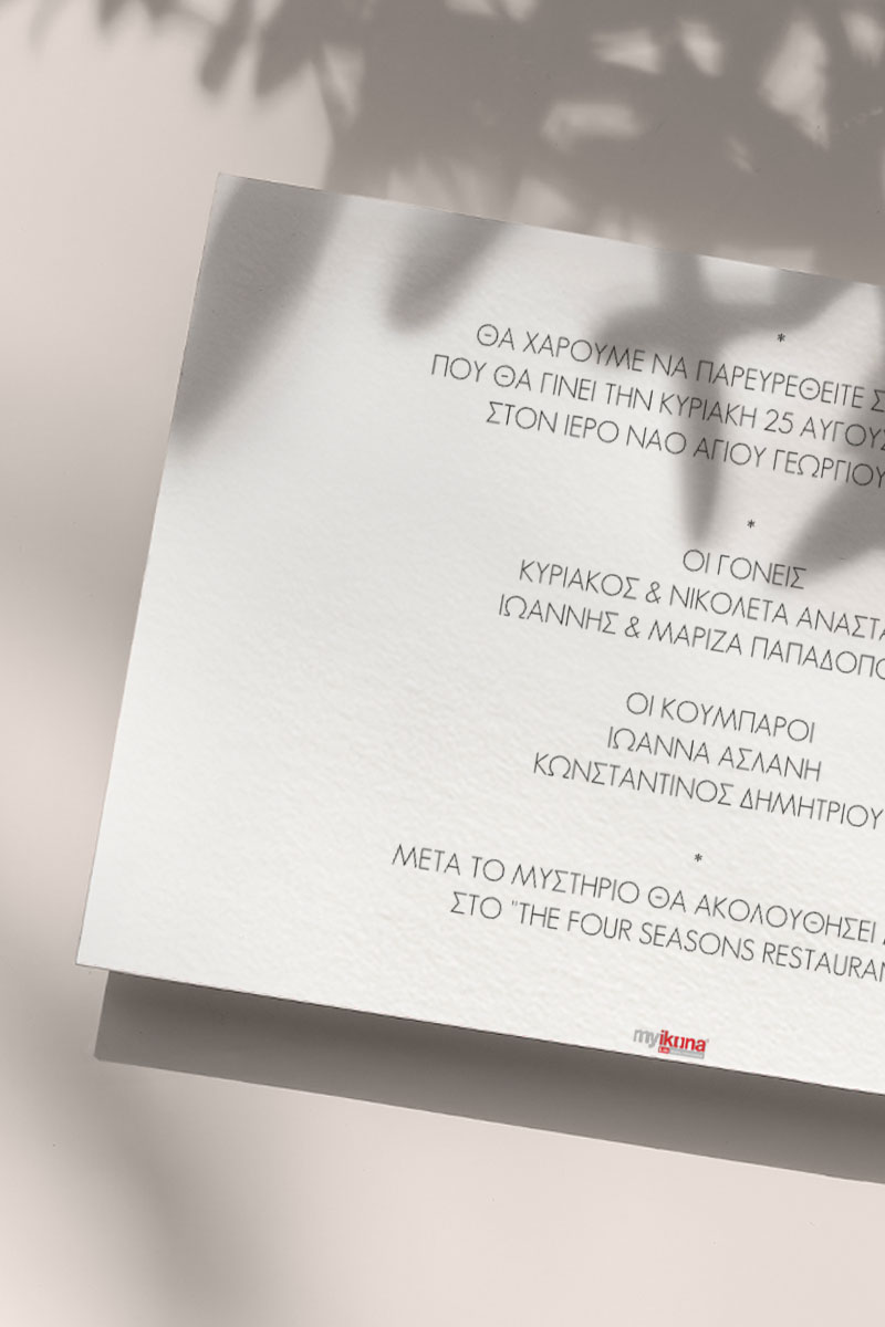Αποκτήστε τα προσκλητήρια γάμου με σχέδιο Minimal Elegance. Οι πελάτες μας τα ξεχωρίζουν για το υψηλής ποιότητας ιταλικό χαρτί και την εκτύπωση υψηλής ευκρίνειας Myikona High Definition. Διαθέσιμα σε διαφορετικές διαστάσεις.