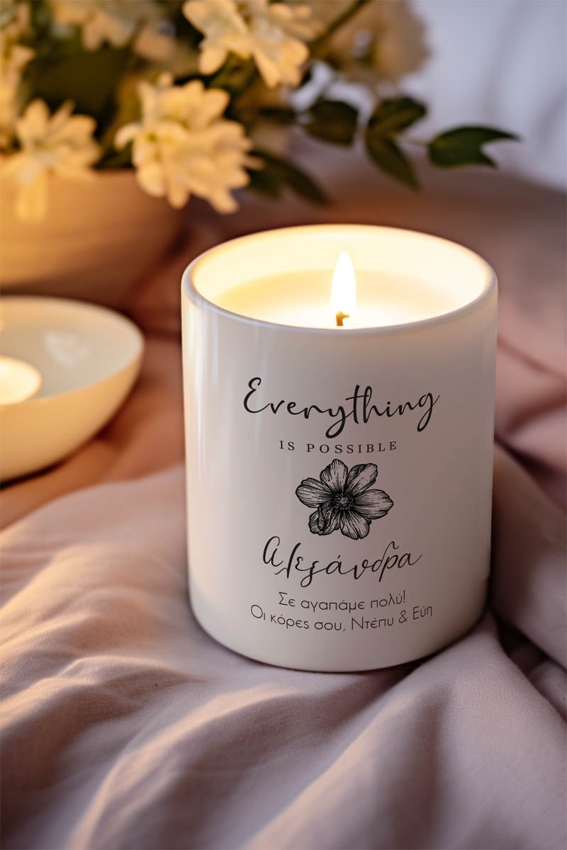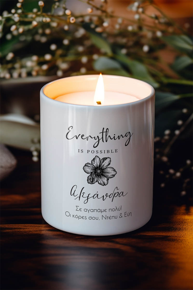 Κάθε κερί μπορεί να προσαρμοστεί με φωτογραφίες που εσείς επιλέγετε, με το όνομά σας ή με μια αφιέρωση που έχει ιδιαίτερη σημασία για εσάς. Επίσης, η προσωποποίηση δημιουργεί ένα χειροποίητο αρωματικό κερί που δεν είναι απλώς αξεσουάρ διακόσμησης. Είναι ένα αντικείμενο που αντικατοπτρίζει την προσωπικότητά σας και τις ξεχωριστές στιγμές της ζωής σας.