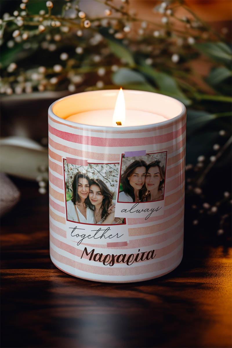 Κάθε κερί μπορεί να προσαρμοστεί με φωτογραφίες που εσείς επιλέγετε, με το όνομά σας ή με μια αφιέρωση που έχει ιδιαίτερη σημασία για εσάς. Επίσης, η προσωποποίηση δημιουργεί ένα χειροποίητο αρωματικό κερί που δεν είναι απλώς αξεσουάρ διακόσμησης. Είναι ένα αντικείμενο που αντικατοπτρίζει την προσωπικότητά σας και τις ξεχωριστές στιγμές της ζωής σας.