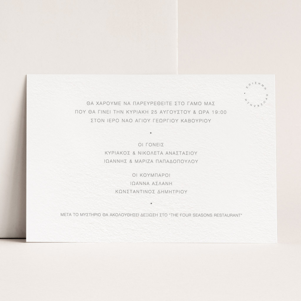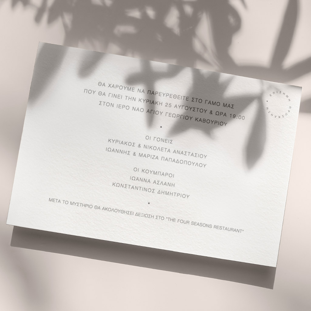 Αποκτήστε τα προσκλητήρια γάμου με σχέδιο Minimal Elegance. Οι πελάτες μας τα ξεχωρίζουν για το υψηλής ποιότητας ιταλικό χαρτί και την εκτύπωση υψηλής ευκρίνειας Myikona High Definition. Διαθέσιμα σε διαφορετικές διαστάσεις.