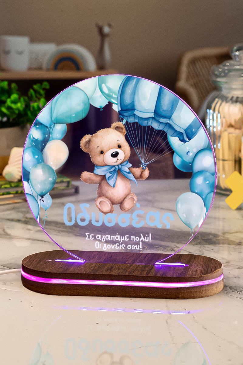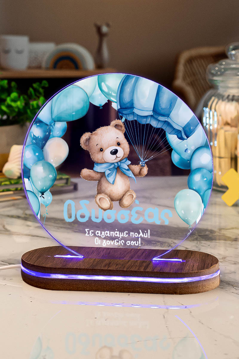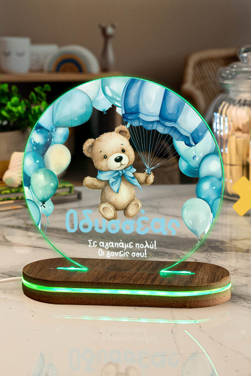 Premium φωτιστικό Led με επιλογή 7 χρωμάτων, προσωποποίηση και σχέδιο Αρκουδάκι Και Μπαλόνια. Χάρισε ένα μοναδικό δώρο που θα λατρέψει κάθε παιδί!