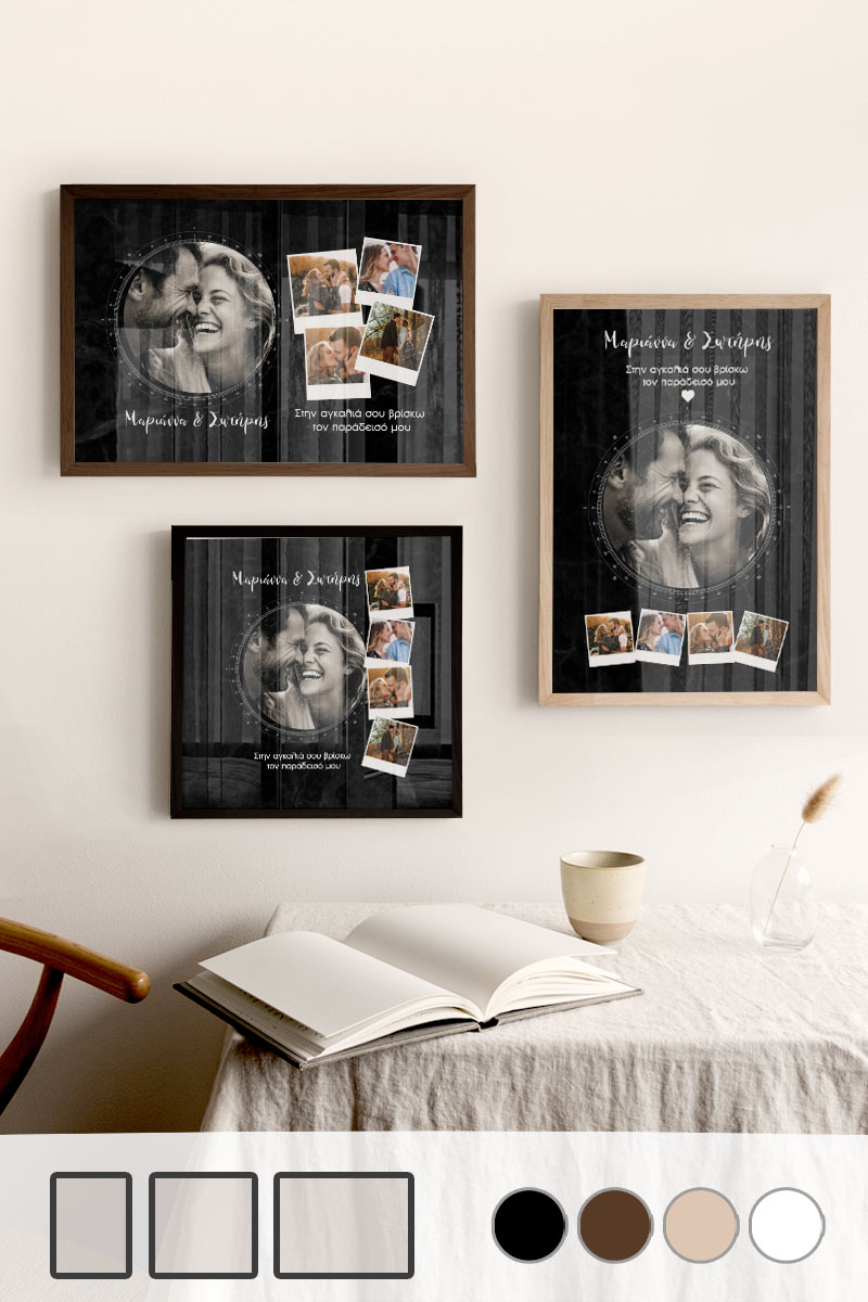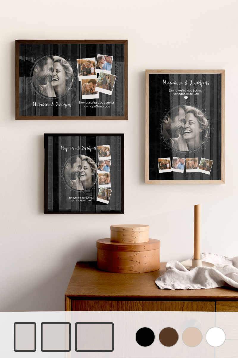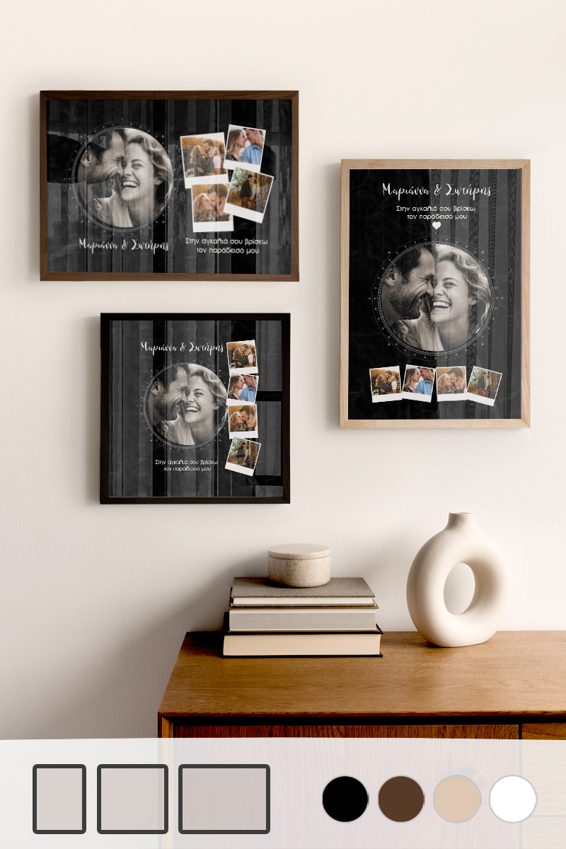 Κάνουμε πιο εύκολο από ποτέ τον τρόπο με τον οποίο μπορείτε να δημιουργήσετε online τα δικά σας έργα τέχνης. Προσθέστε στις κορνίζες σας μονογράμματα, κείμενα, λεζάντες και πολλά άλλα. Σε λίγα λεπτά, μπορείτε να παραγγείλετε ένα έργο τέχνης που θα μετατρέψει έναν συνηθισμένο τοίχο στο σημείο εστίασης οποιουδήποτε δωματίου. Μπορείτε να δημιουργήσετε κορνίζες με τις καθημερινές σας στιγμές, το Γάμο σας, τη Βάπτιση του παιδιού σας, τα ταξίδια σας, τις διακοπές σας, τις σημαντικές στιγμές σας και πολλά άλλα.