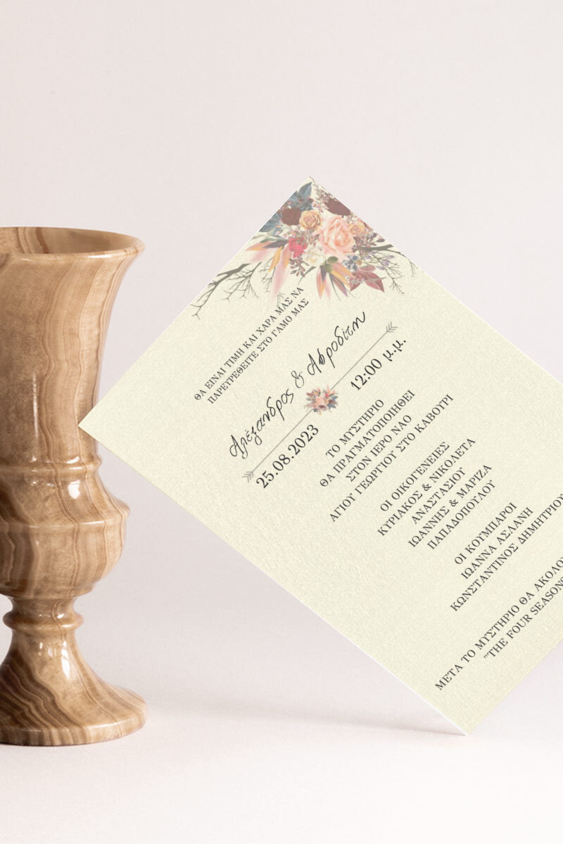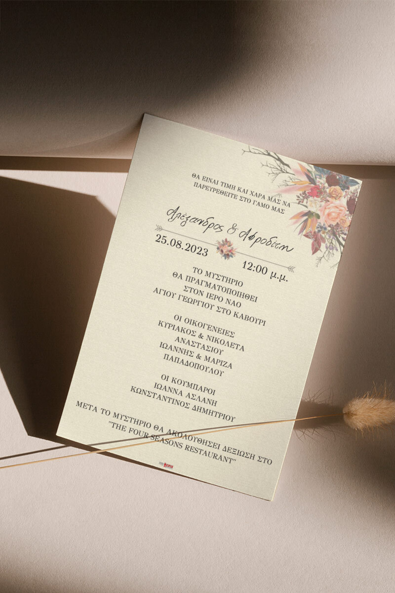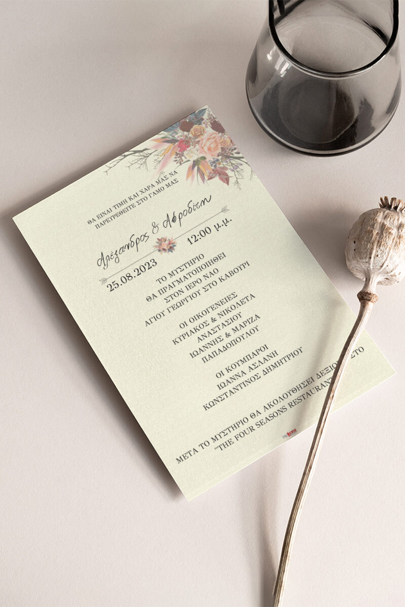 Αποκτήστε τα προσκλητήρια γάμου με σχέδιο Boho Κόκκινα Λουλούδια. Οι πελάτες μας τα ξεχωρίζουν για το υψηλής ποιότητας ιταλικό χαρτί και την εκτύπωση υψηλής ευκρίνειας Myikona High Definition. Διαθέσιμα σε διαφορετικές διαστάσεις.