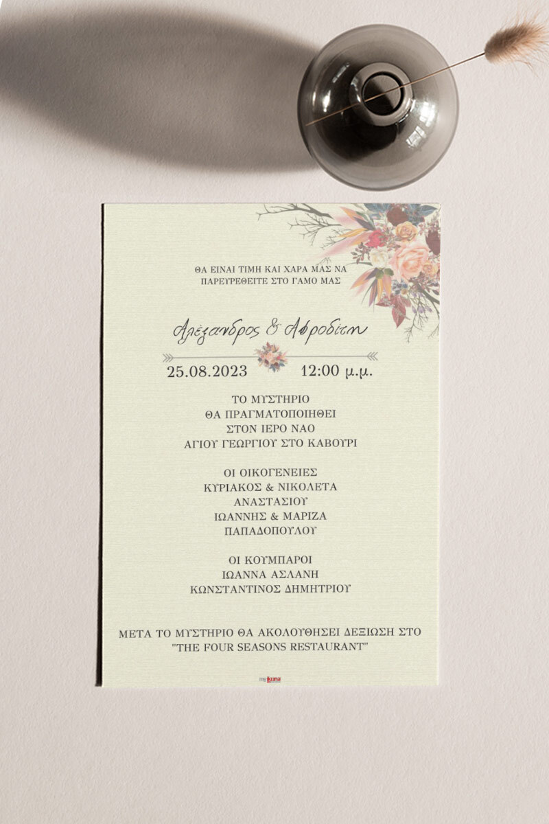 Αποκτήστε τα προσκλητήρια γάμου με σχέδιο Minimal Ανθισμένα Λουλούδια. Οι πελάτες μας τα ξεχωρίζουν για το υψηλής ποιότητας ιταλικό χαρτί και την εκτύπωση υψηλής ευκρίνειας Myikona High Definition. Διαθέσιμα σε διαφορετικές διαστάσεις.