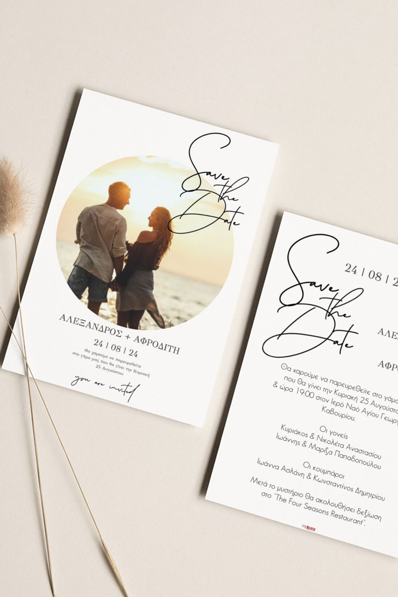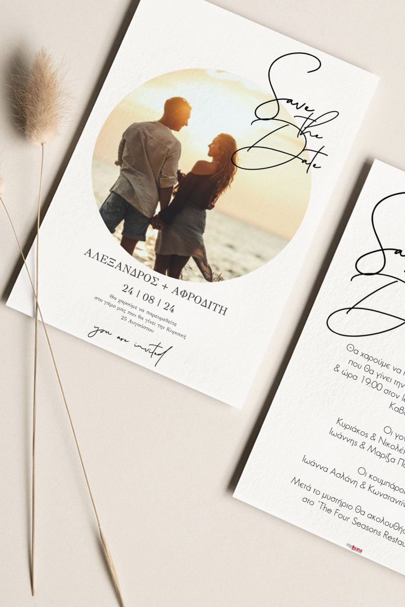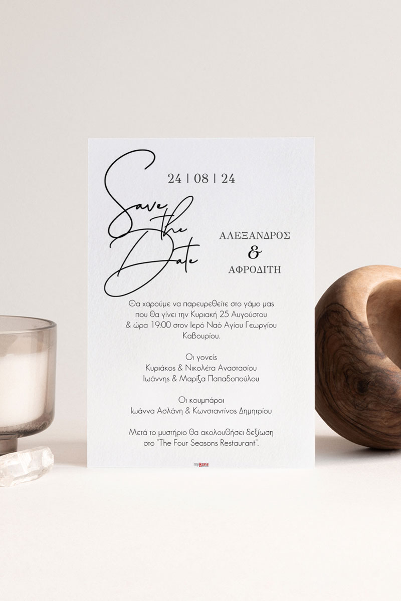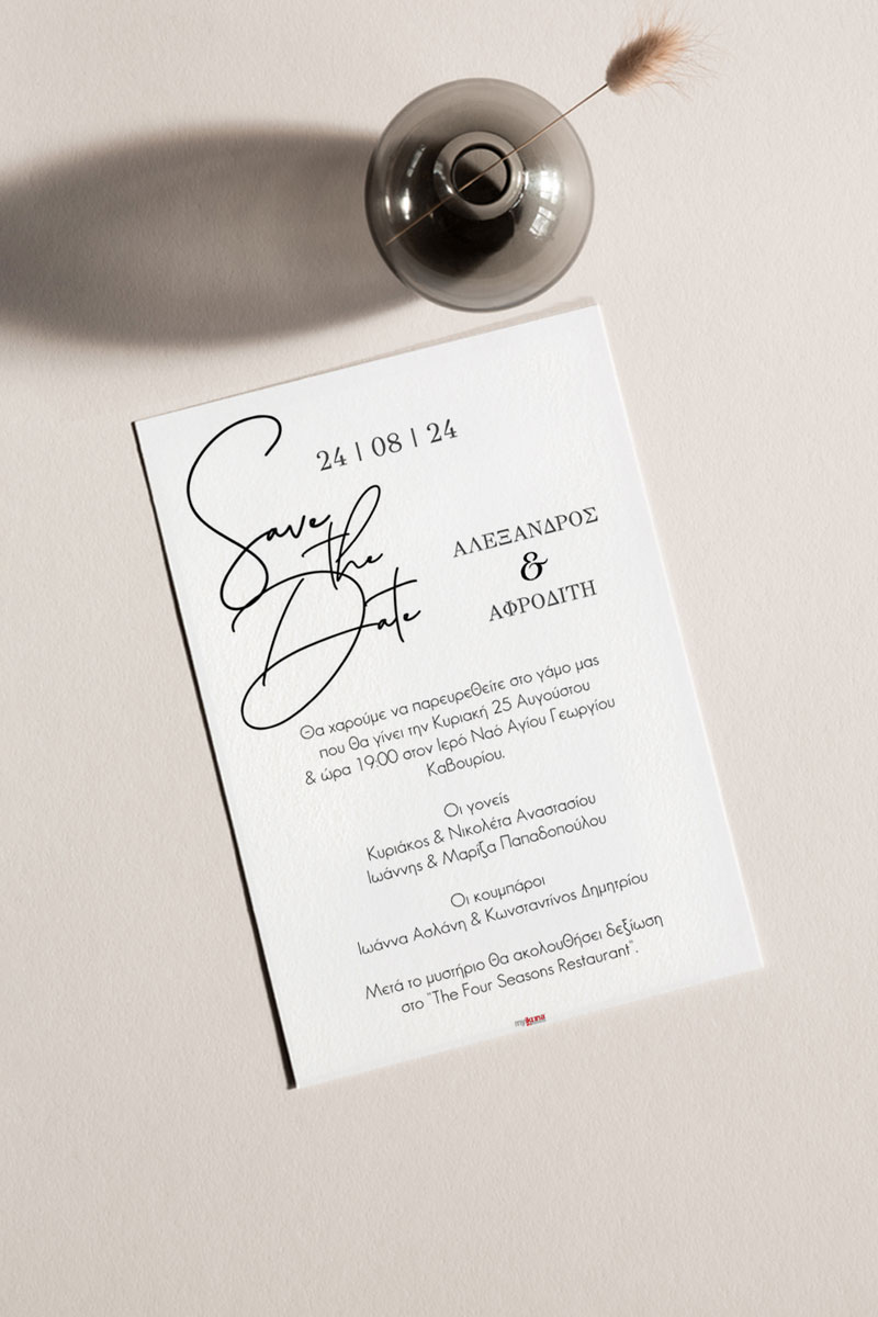 Αποκτήστε τα προσκλητήρια γάμου με σχέδιο Minimal Elegance. Οι πελάτες μας τα ξεχωρίζουν για το υψηλής ποιότητας ιταλικό χαρτί και την εκτύπωση υψηλής ευκρίνειας Myikona High Definition. Διαθέσιμα σε διαφορετικές διαστάσεις.