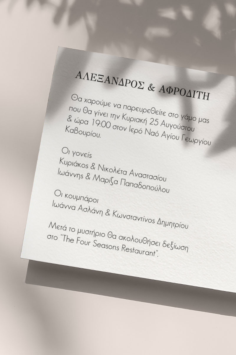 Αποκτήστε τα προσκλητήρια γάμου με σχέδιο Minimal Elegance. Οι πελάτες μας τα ξεχωρίζουν για το υψηλής ποιότητας ιταλικό χαρτί και την εκτύπωση υψηλής ευκρίνειας Myikona High Definition. Διαθέσιμα σε διαφορετικές διαστάσεις.