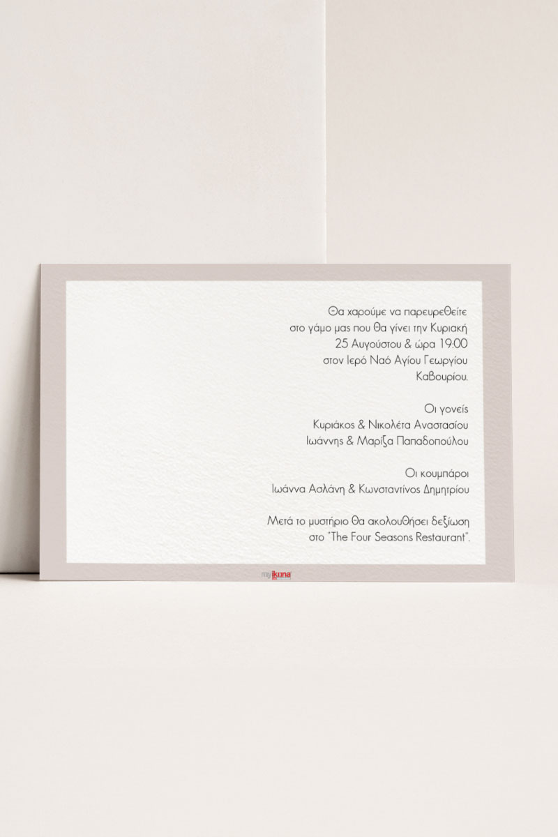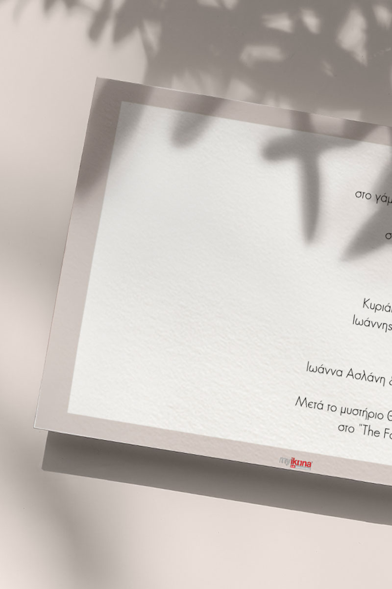 Αποκτήστε τα προσκλητήρια γάμου με σχέδιο Minimal Elegance. Οι πελάτες μας τα ξεχωρίζουν για το υψηλής ποιότητας ιταλικό χαρτί και την εκτύπωση υψηλής ευκρίνειας Myikona High Definition. Διαθέσιμα σε διαφορετικές διαστάσεις.