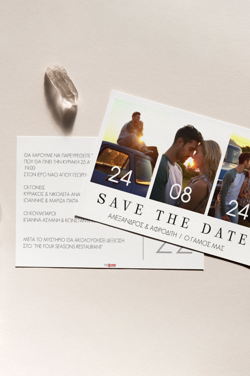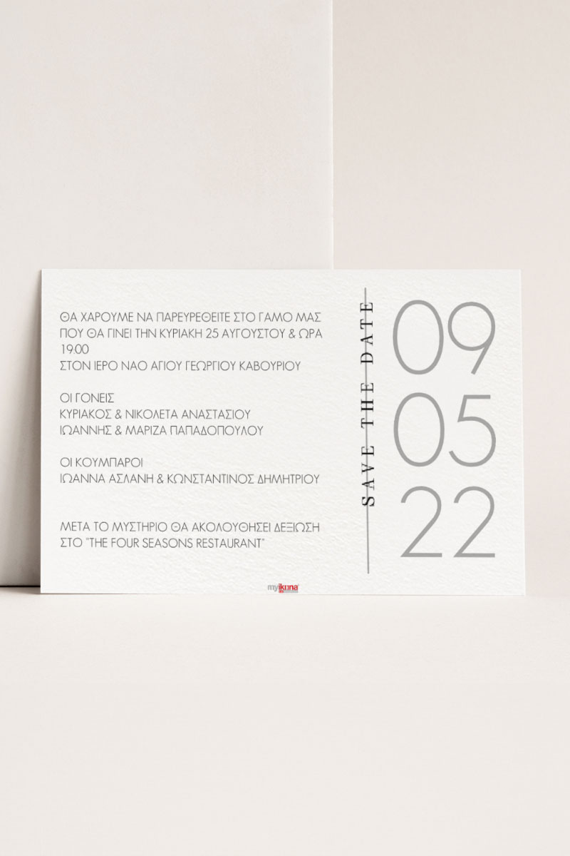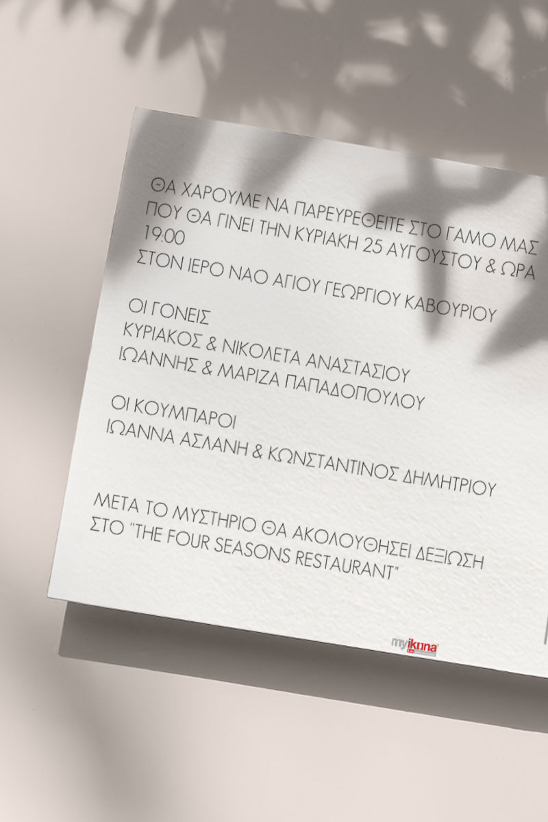 Αποκτήστε τα προσκλητήρια γάμου με σχέδιο Minimal Elegance. Οι πελάτες μας τα ξεχωρίζουν για το υψηλής ποιότητας ιταλικό χαρτί και την εκτύπωση υψηλής ευκρίνειας Myikona High Definition. Διαθέσιμα σε διαφορετικές διαστάσεις.