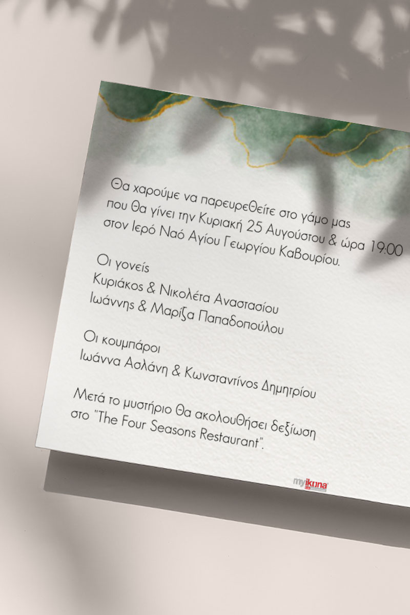 Αποκτήστε τα προσκλητήρια γάμου με σχέδιο Minimal Elegance. Οι πελάτες μας τα ξεχωρίζουν για το υψηλής ποιότητας ιταλικό χαρτί και την εκτύπωση υψηλής ευκρίνειας Myikona High Definition. Διαθέσιμα σε διαφορετικές διαστάσεις.