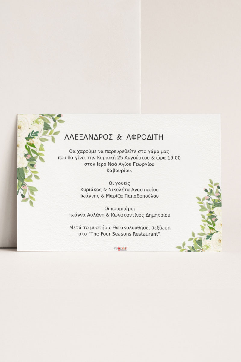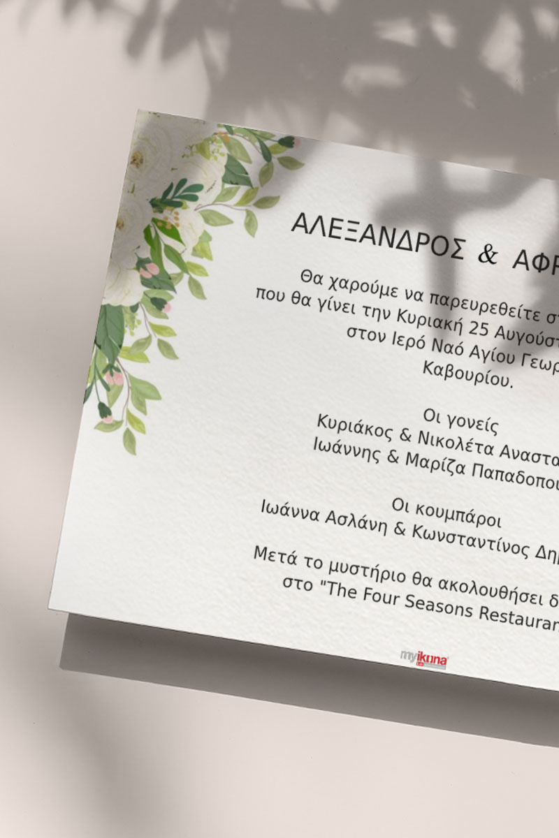 Αποκτήστε τα προσκλητήρια γάμου με σχέδιο Minimal Ανθισμένα Λουλούδια. Οι πελάτες μας τα ξεχωρίζουν για το υψηλής ποιότητας ιταλικό χαρτί και την εκτύπωση υψηλής ευκρίνειας Myikona High Definition. Διαθέσιμα σε διαφορετικές διαστάσεις.