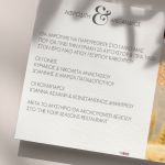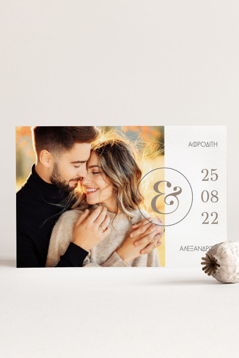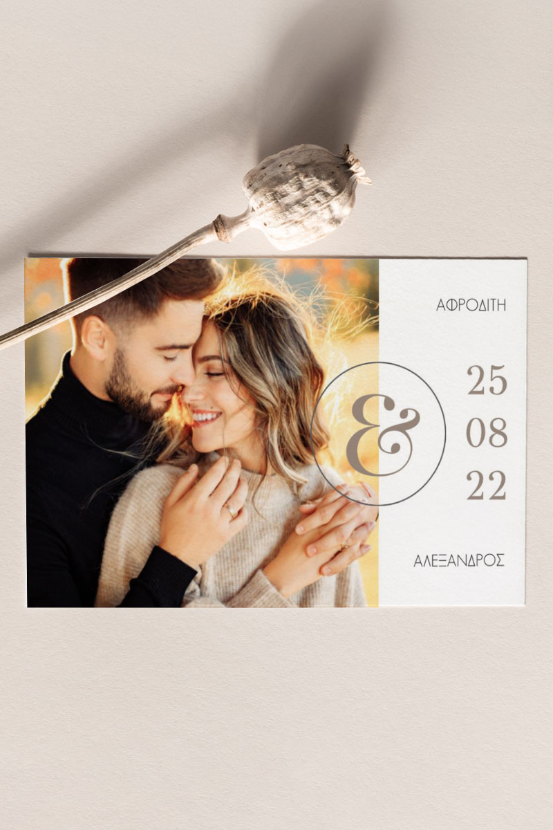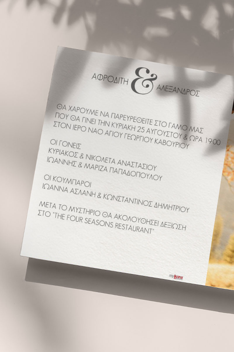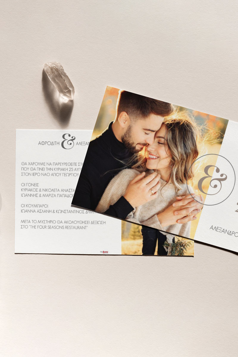 Αποκτήστε τα προσκλητήρια γάμου με σχέδιο Minimal Elegance. Οι πελάτες μας τα ξεχωρίζουν για το υψηλής ποιότητας ιταλικό χαρτί και την εκτύπωση υψηλής ευκρίνειας Myikona High Definition. Διαθέσιμα σε διαφορετικές διαστάσεις.