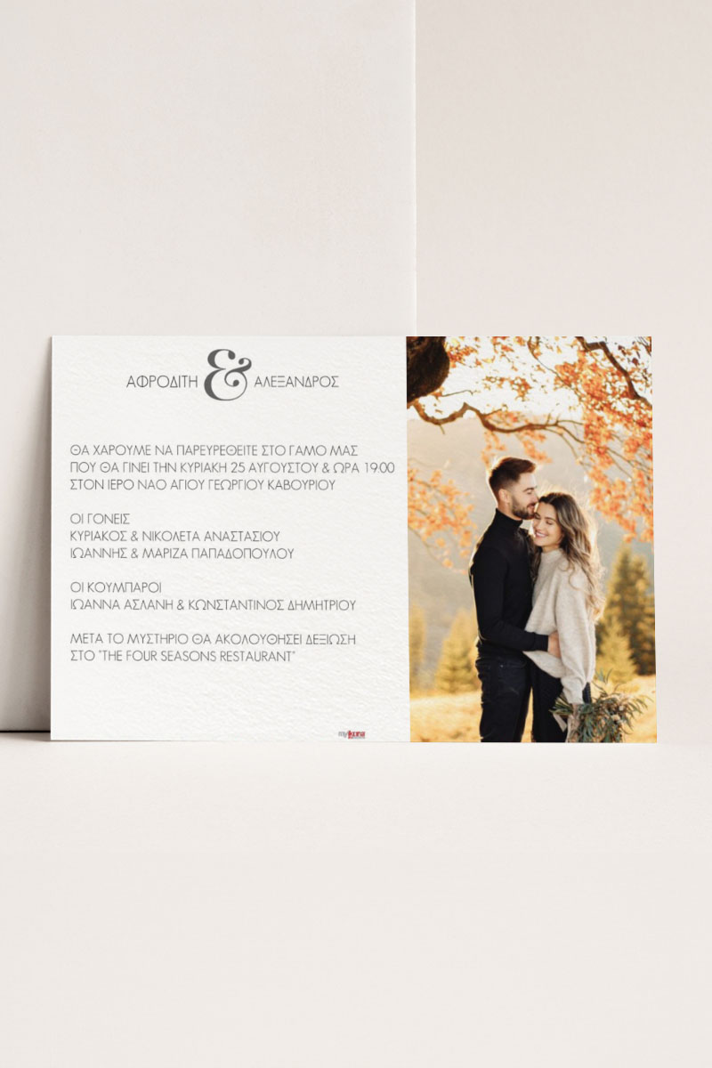 Αποκτήστε τα προσκλητήρια γάμου με σχέδιο Plain and Simple. Οι πελάτες μας τα ξεχωρίζουν για το υψηλής ποιότητας ιταλικό χαρτί και την εκτύπωση υψηλής ευκρίνειας Myikona High Definition. Διαθέσιμα σε διαφορετικές διαστάσεις.