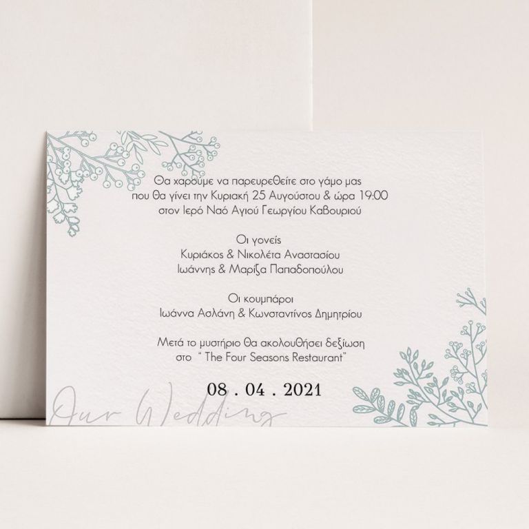Αποκτήστε τα προσκλητήρια γάμου με σχέδιο Minimal Ανθισμένα Λουλούδια. Οι πελάτες μας τα ξεχωρίζουν για το υψηλής ποιότητας ιταλικό χαρτί και την εκτύπωση υψηλής ευκρίνειας Myikona High Definition. Διαθέσιμα σε διαφορετικές διαστάσεις.