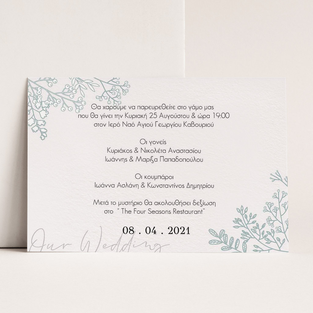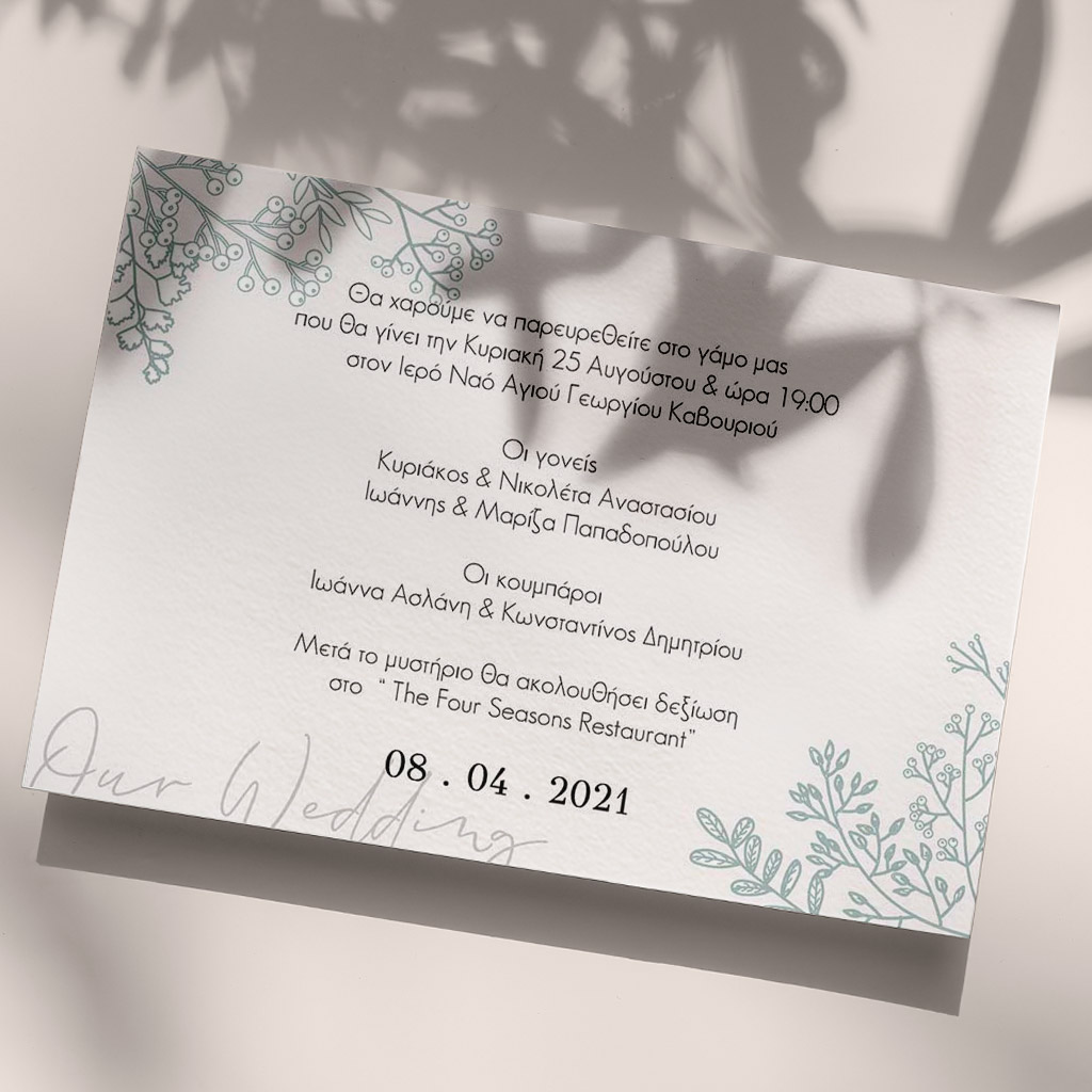 Αποκτήστε τα προσκλητήρια γάμου με σχέδιο Minimal Ανθισμένα Λουλούδια. Οι πελάτες μας τα ξεχωρίζουν για το υψηλής ποιότητας ιταλικό χαρτί και την εκτύπωση υψηλής ευκρίνειας Myikona High Definition. Διαθέσιμα σε διαφορετικές διαστάσεις.