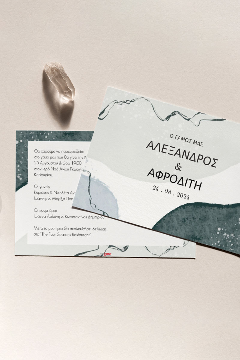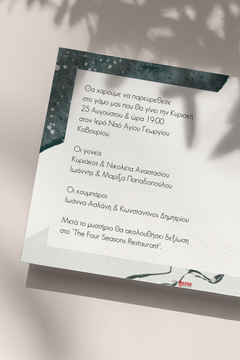 Αποκτήστε τα προσκλητήρια γάμου με σχέδιο Minimal Elegance. Οι πελάτες μας τα ξεχωρίζουν για το υψηλής ποιότητας ιταλικό χαρτί και την εκτύπωση υψηλής ευκρίνειας Myikona High Definition. Διαθέσιμα σε διαφορετικές διαστάσεις.