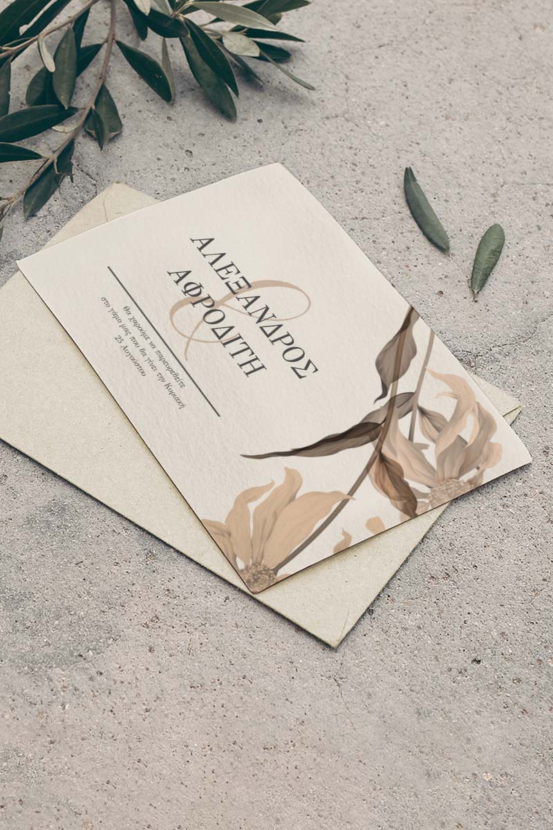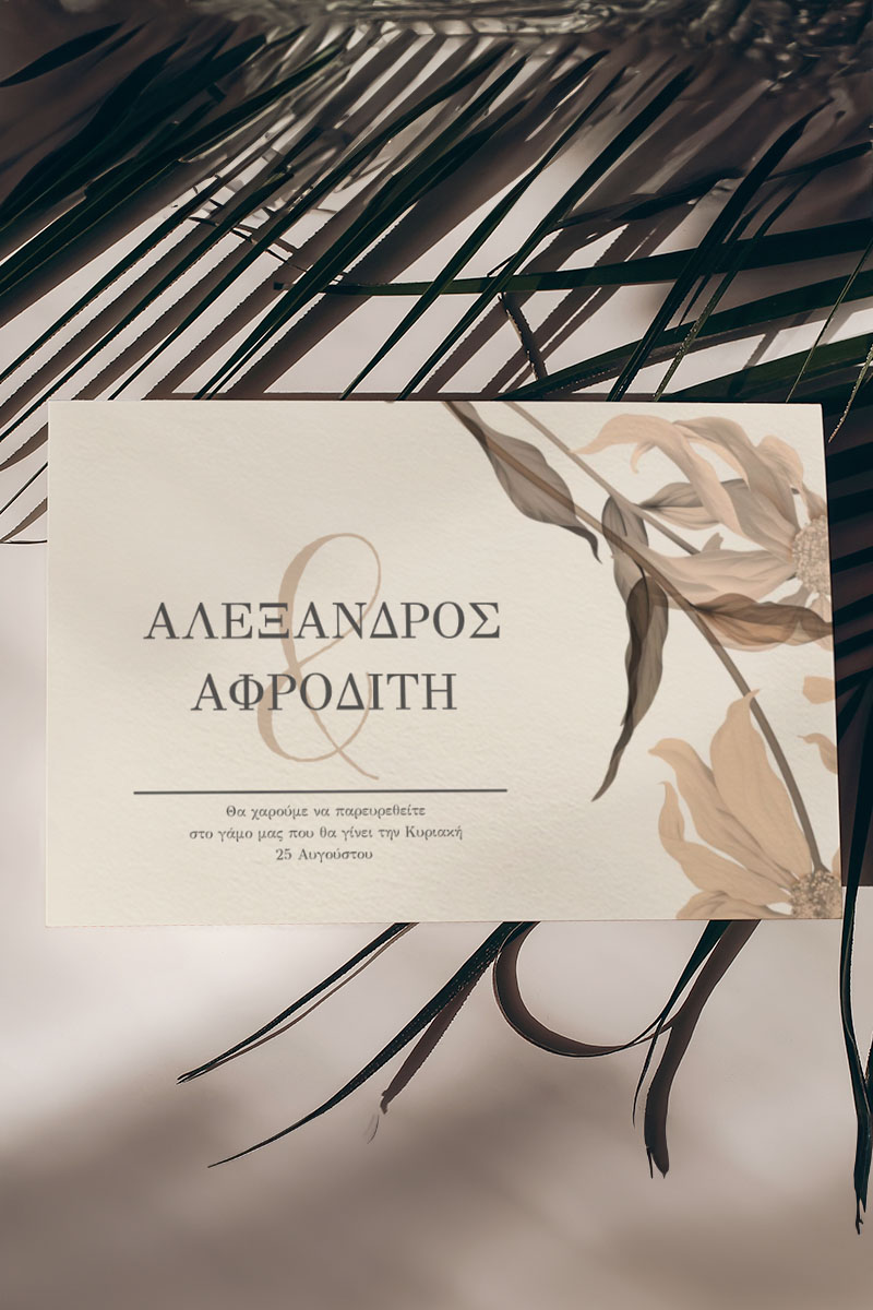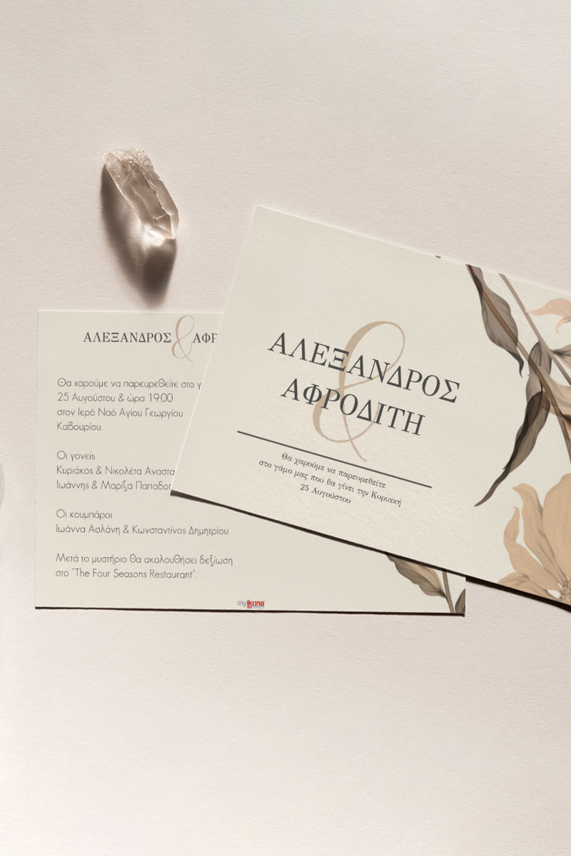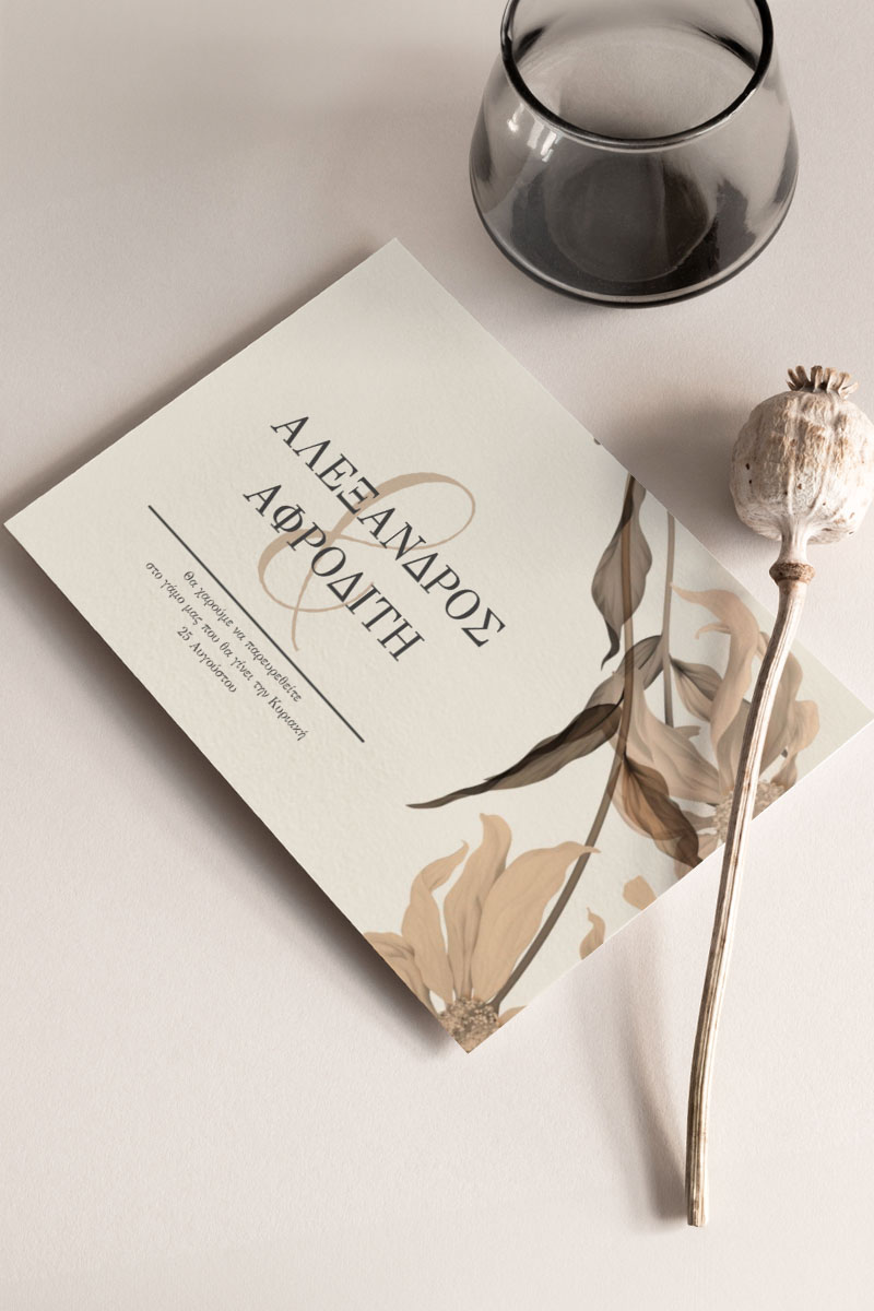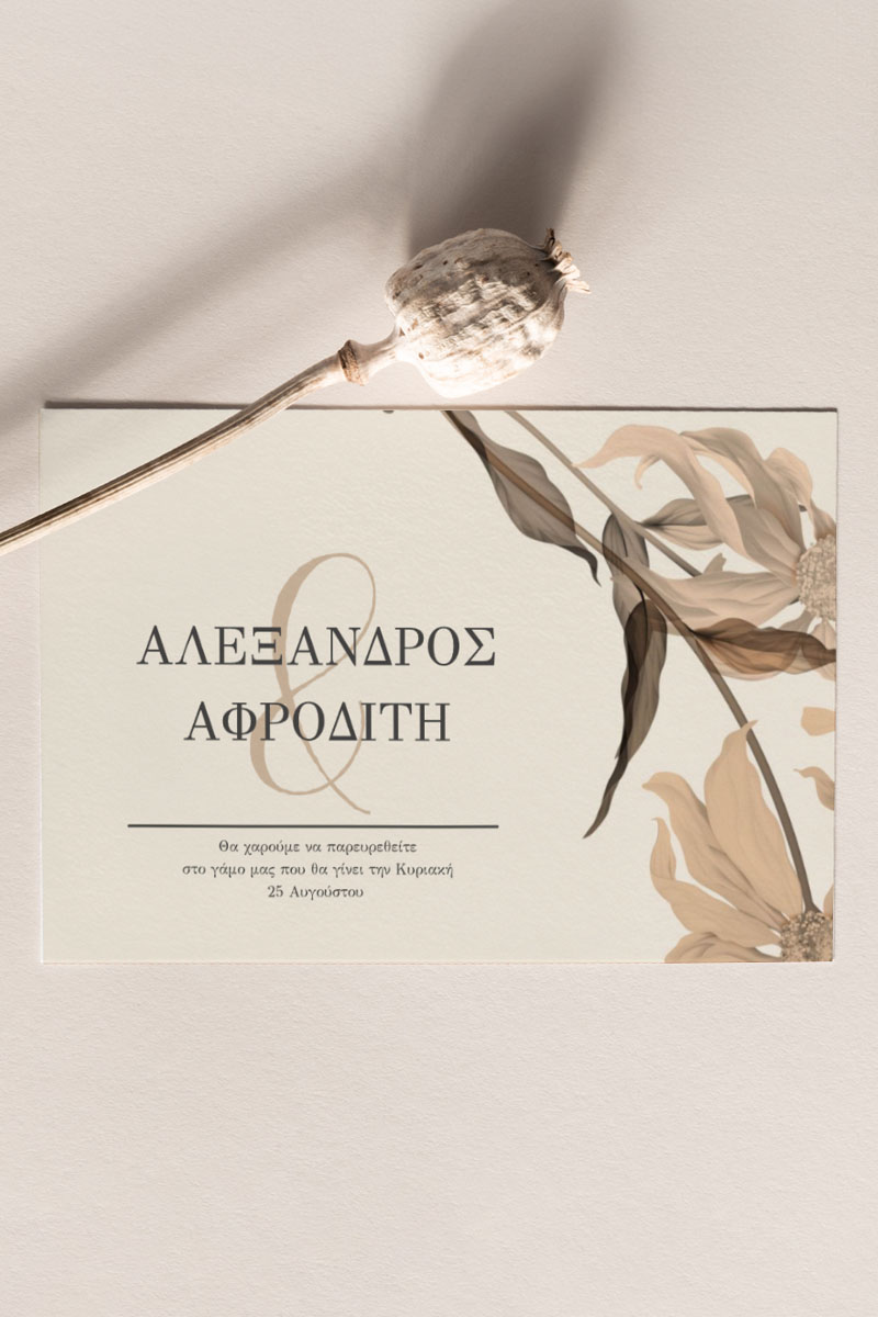 Αποκτήστε τα προσκλητήρια γάμου με σχέδιο Minimal Ανθισμένα Λουλούδια. Οι πελάτες μας τα ξεχωρίζουν για το υψηλής ποιότητας ιταλικό χαρτί και την εκτύπωση υψηλής ευκρίνειας Myikona High Definition. Διαθέσιμα σε διαφορετικές διαστάσεις.