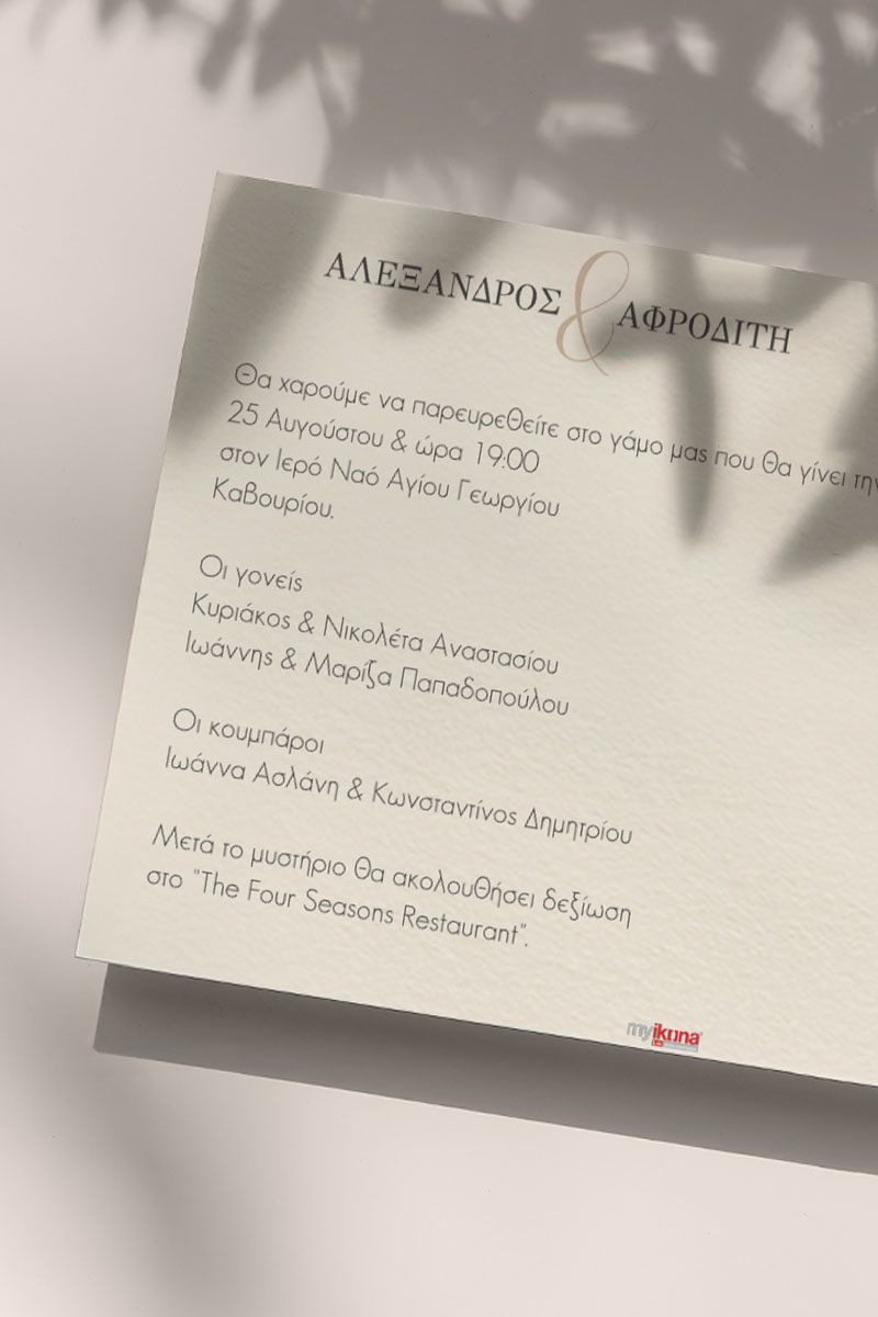 Αποκτήστε τα προσκλητήρια γάμου με σχέδιο Minimal Elegance. Οι πελάτες μας τα ξεχωρίζουν για το υψηλής ποιότητας ιταλικό χαρτί και την εκτύπωση υψηλής ευκρίνειας Myikona High Definition. Διαθέσιμα σε διαφορετικές διαστάσεις.
