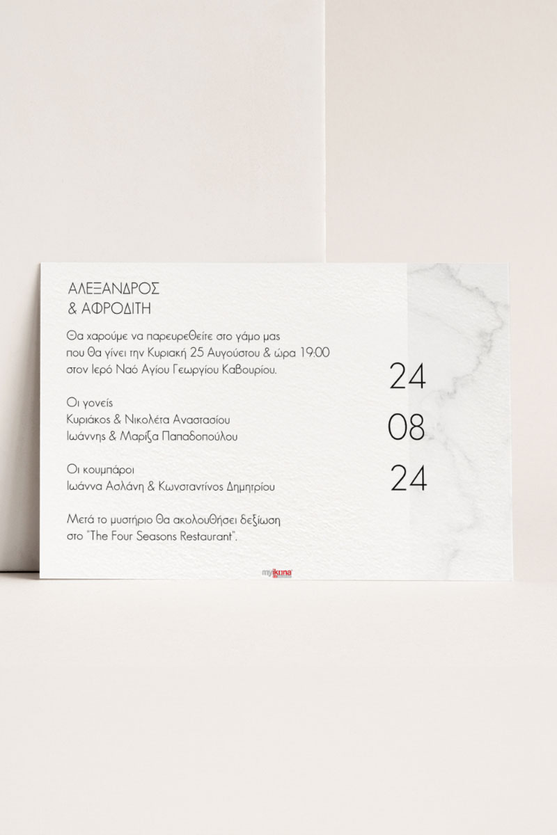 Αποκτήστε τα προσκλητήρια γάμου με σχέδιο Minimal Elegance. Οι πελάτες μας τα ξεχωρίζουν για το υψηλής ποιότητας ιταλικό χαρτί και την εκτύπωση υψηλής ευκρίνειας Myikona High Definition. Διαθέσιμα σε διαφορετικές διαστάσεις.