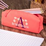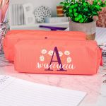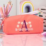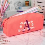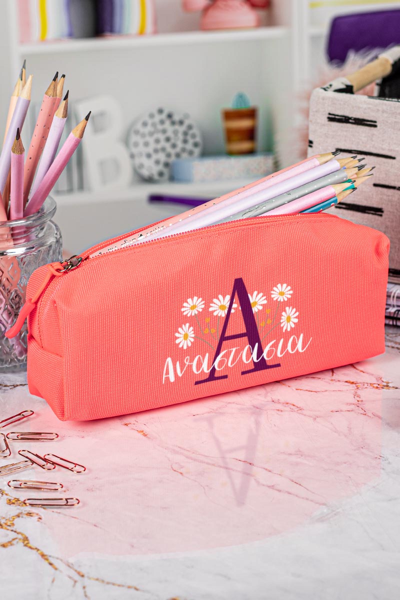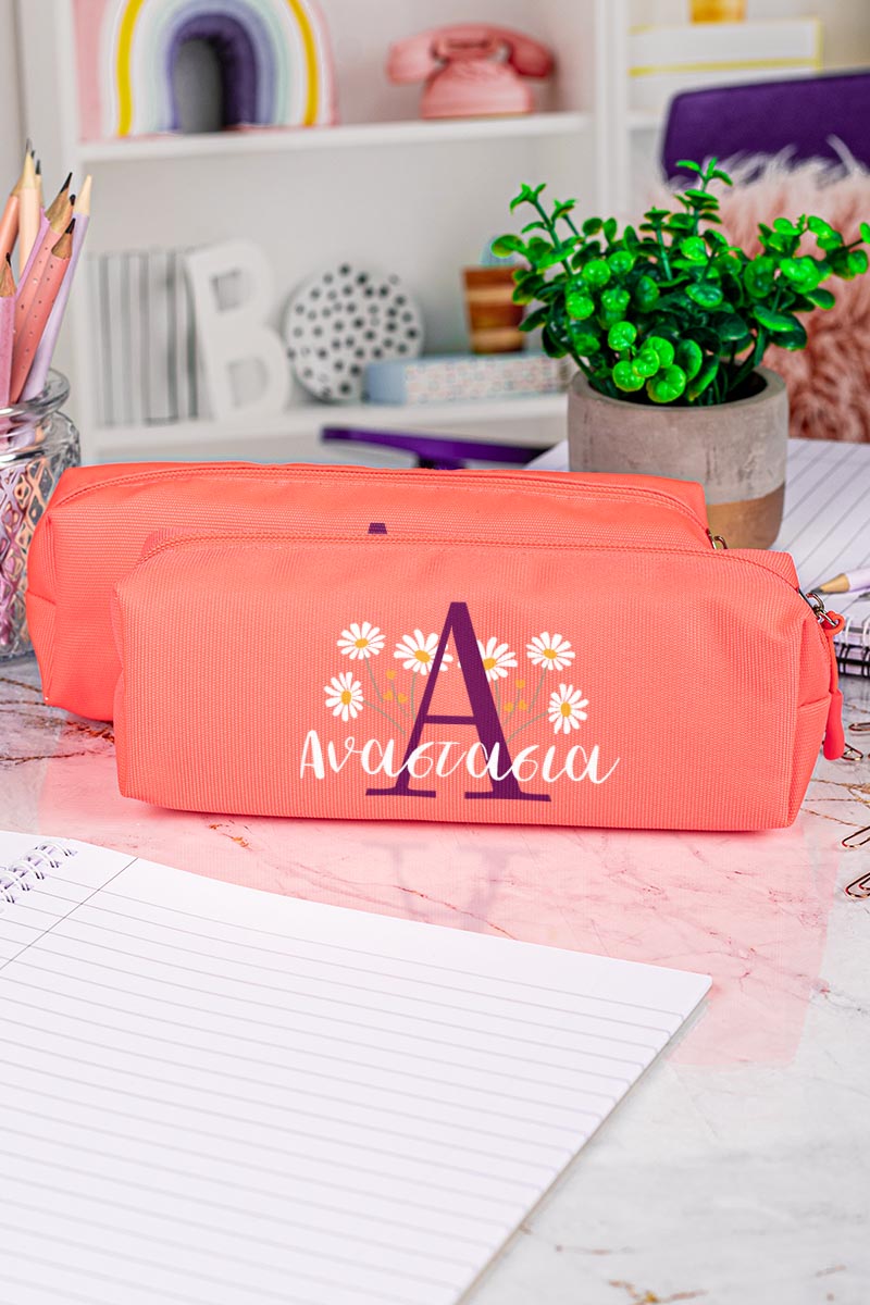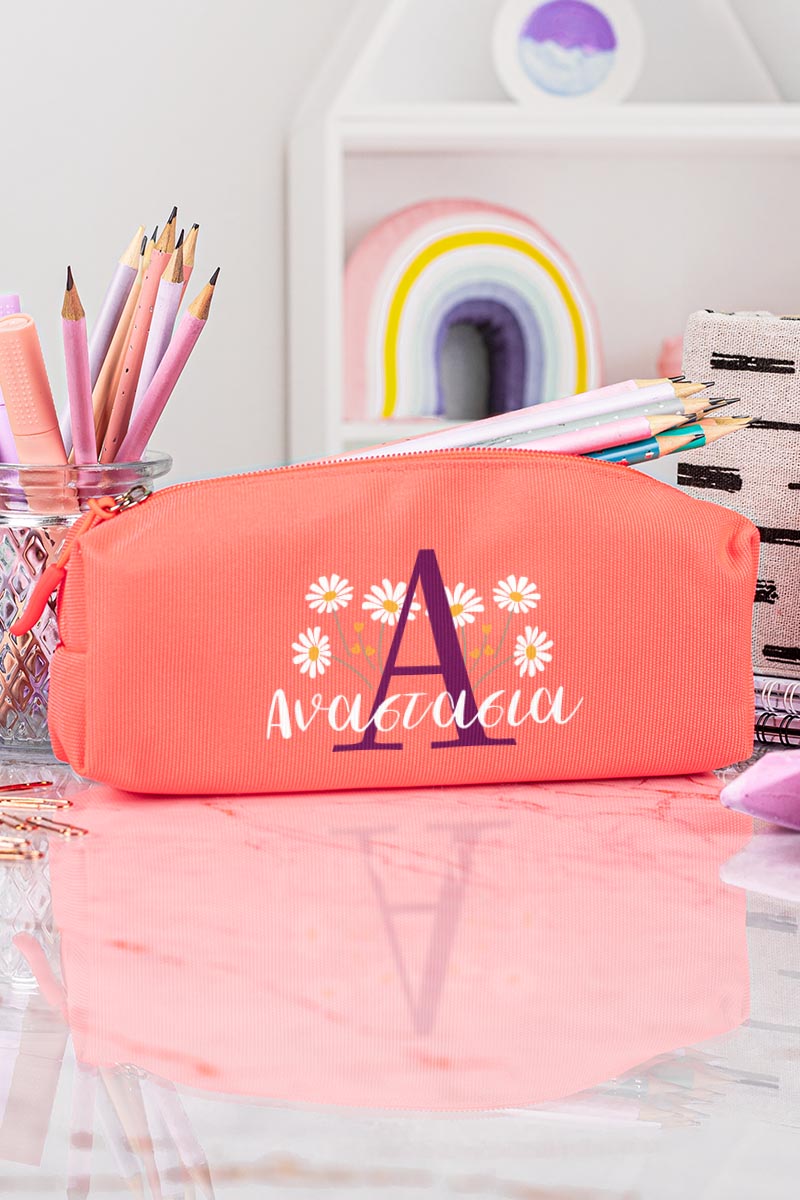 Σχολική Κασετίνα με Όνομα, σε Κοραλί Χρώμα & Σχέδιο Daisies