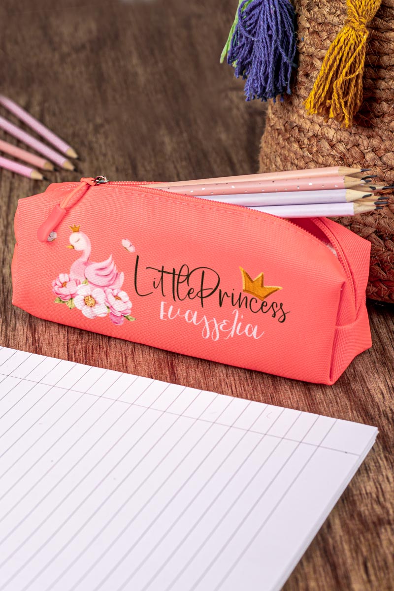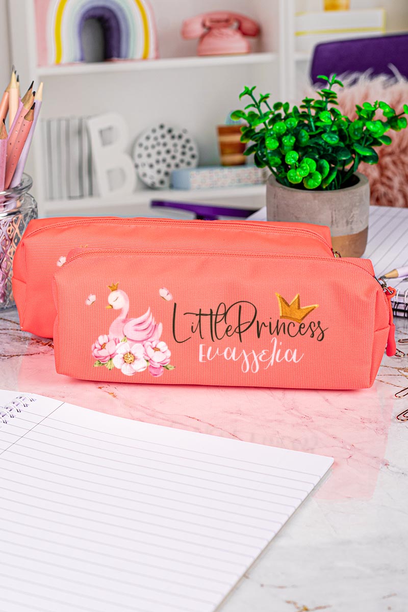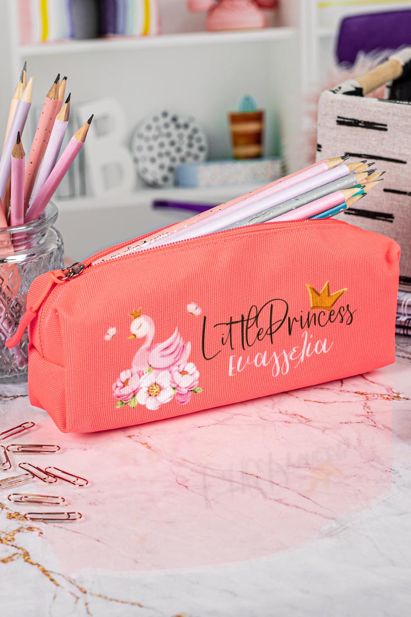 Σχολική Κασετίνα με Όνομα, σε Κοραλί Χρώμα & Σχέδιο Swan