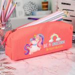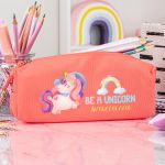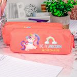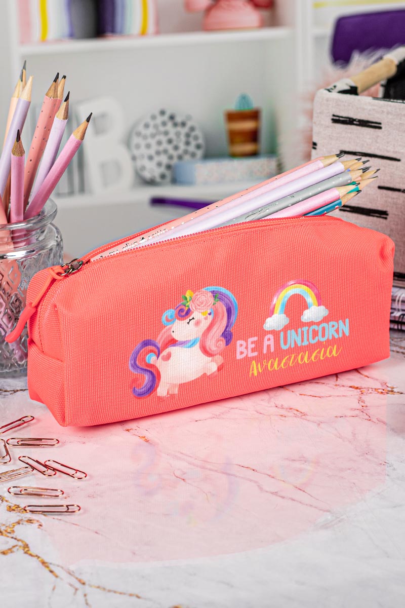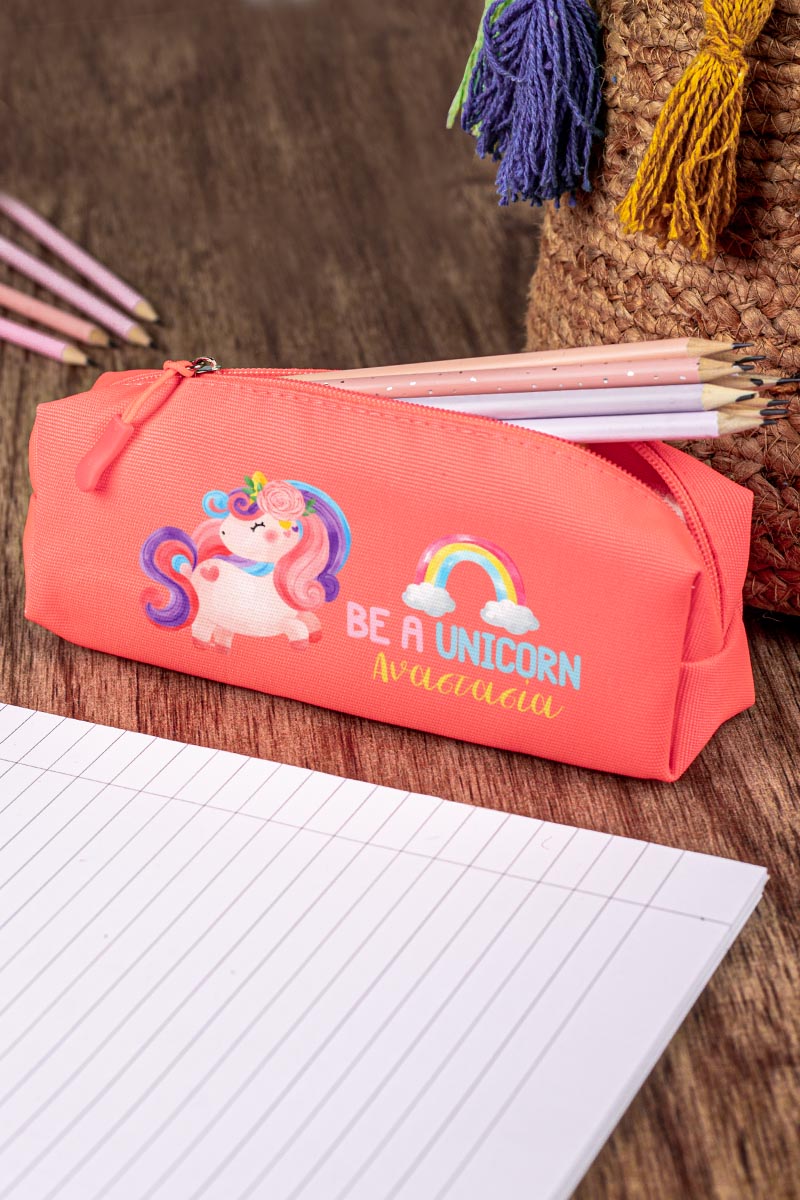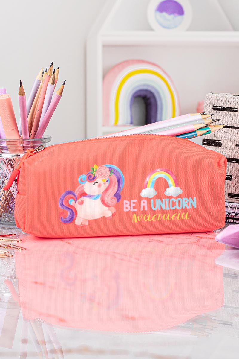 Σχολική Κασετίνα με Όνομα, σε Κοραλί Χρώμα & Σχέδιο Unicorn