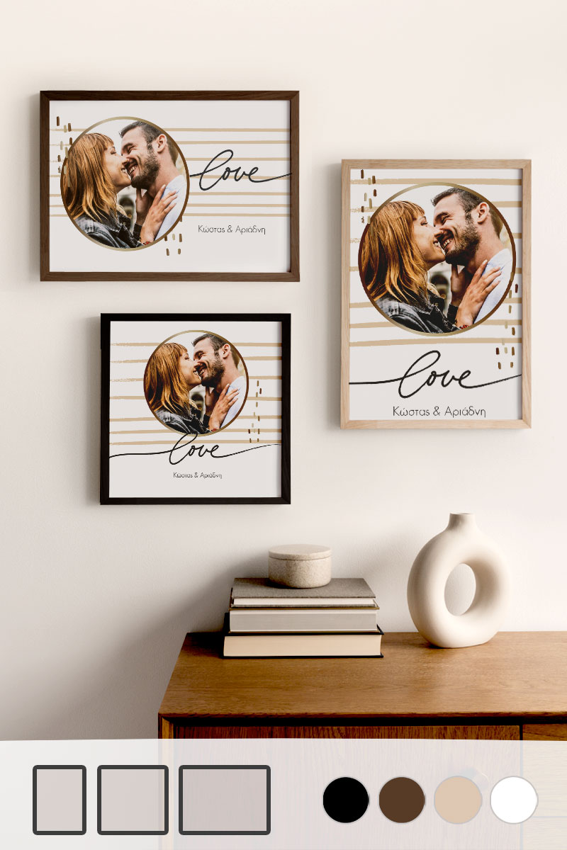 Κάνουμε πιο εύκολο από ποτέ τον τρόπο με τον οποίο μπορείτε να δημιουργήσετε online τα δικά σας έργα τέχνης. Προσθέστε στις κορνίζες σας μονογράμματα, κείμενα, λεζάντες και πολλά άλλα. Σε λίγα λεπτά, μπορείτε να παραγγείλετε ένα έργο τέχνης που θα μετατρέψει έναν συνηθισμένο τοίχο στο σημείο εστίασης οποιουδήποτε δωματίου. Μπορείτε να δημιουργήσετε κορνίζες με τις καθημερινές σας στιγμές, το Γάμο σας, τη Βάπτιση του παιδιού σας, τα ταξίδια σας, τις διακοπές σας, τις σημαντικές στιγμές σας και πολλά άλλα.