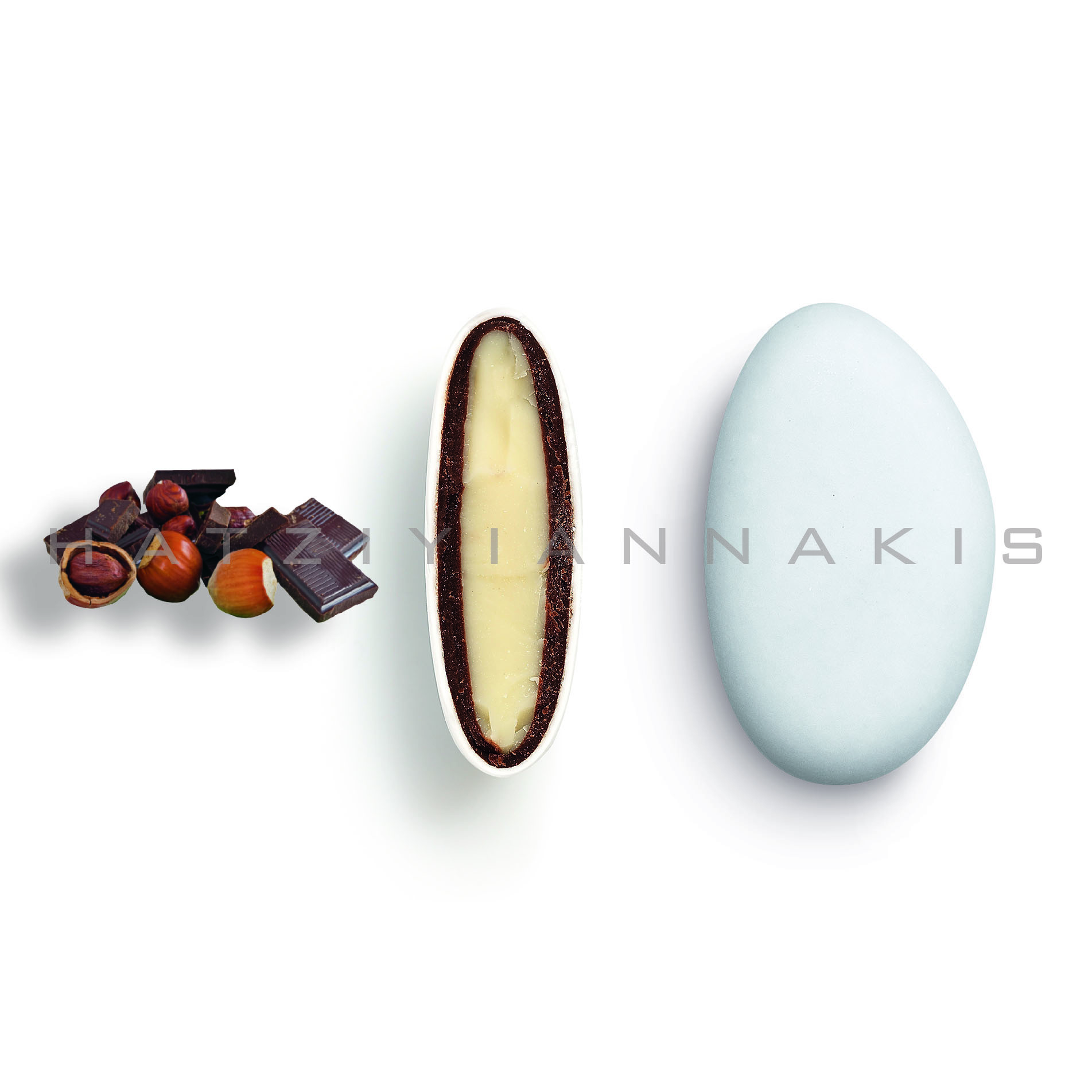 Λευκή σοκολάτα & σοκολάτα ( 55% κακάο) με λεπτή επικάλυψη ζάχαρης, γεύση gianduia.