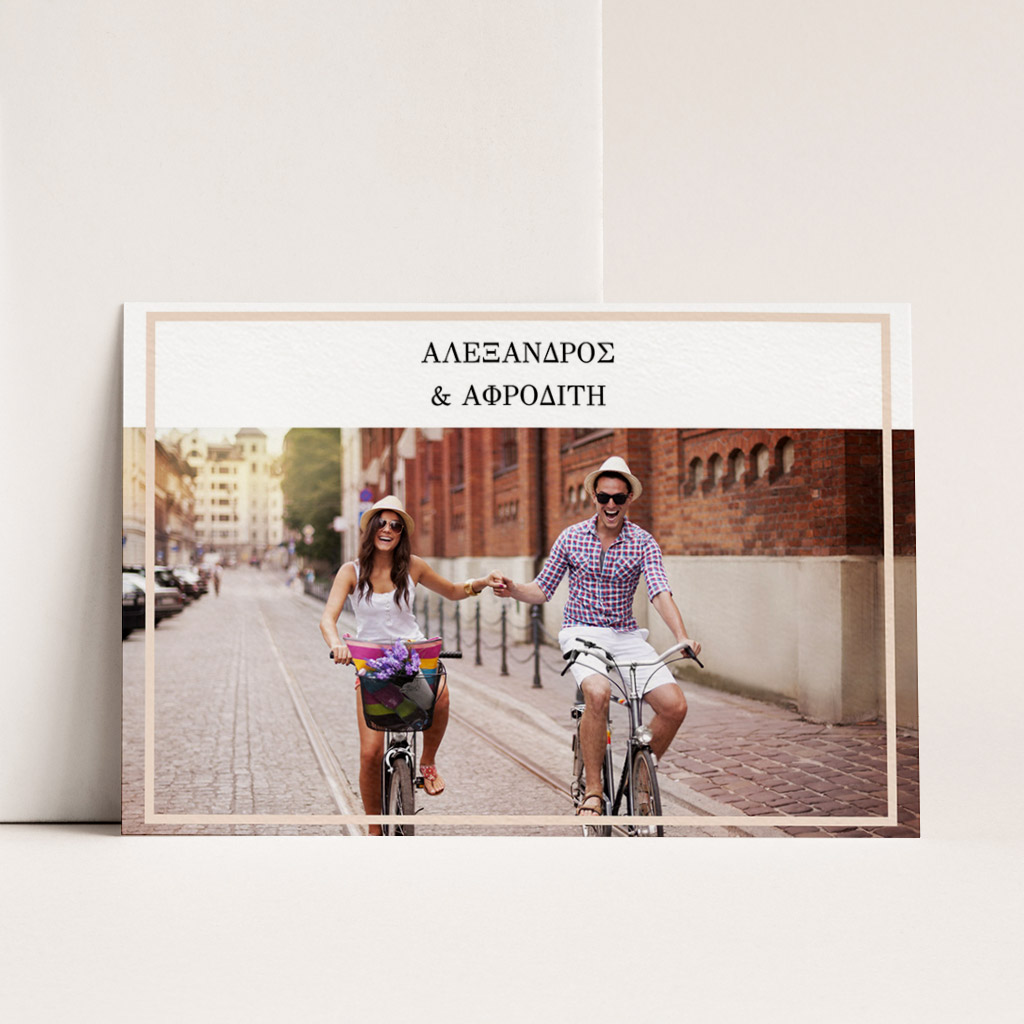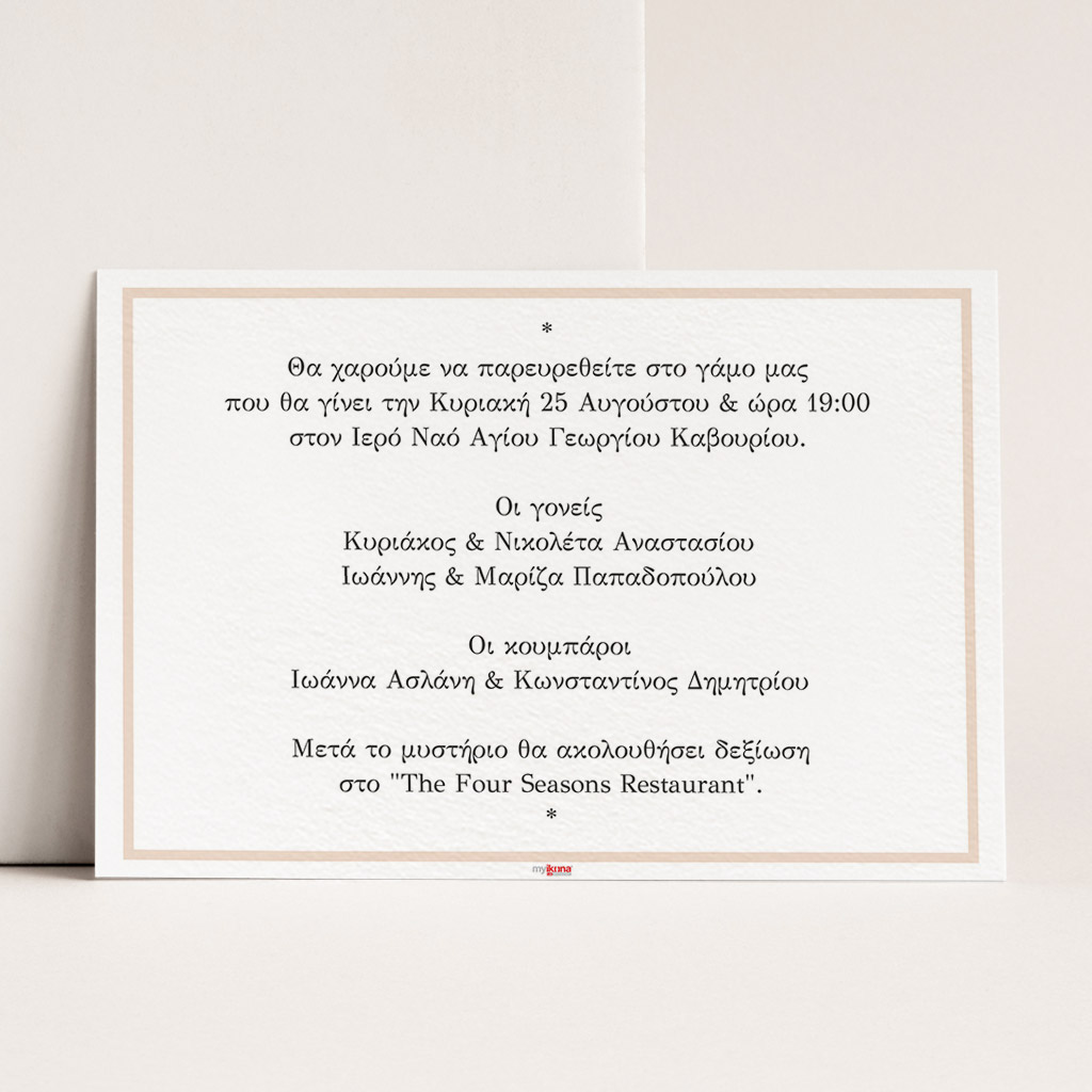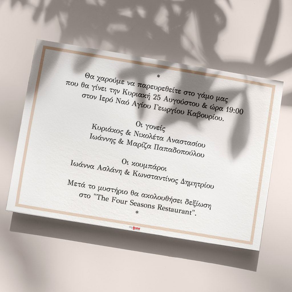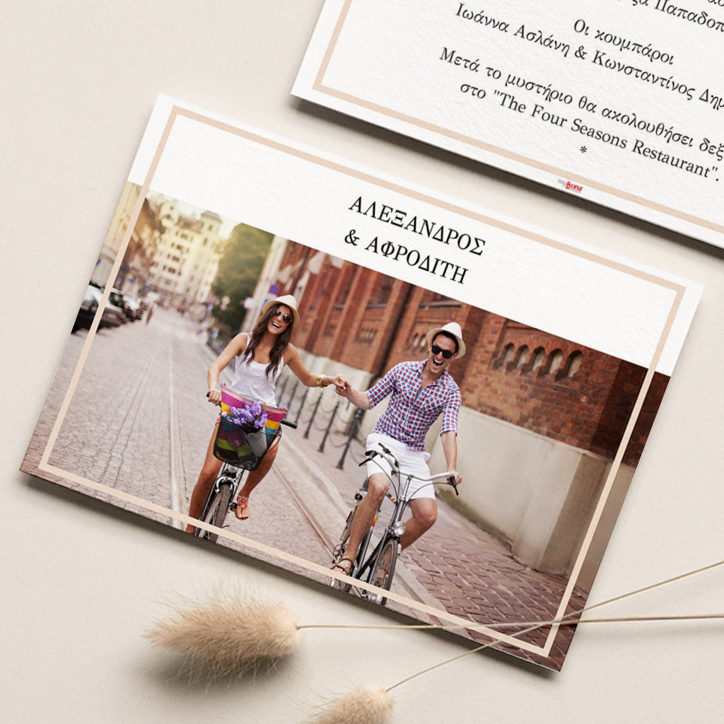 Αποκτήστε τα προσκλητήρια γάμου με σχέδιο Minimal Elegance. Οι πελάτες μας τα ξεχωρίζουν για το υψηλής ποιότητας ιταλικό χαρτί και την εκτύπωση υψηλής ευκρίνειας Myikona High Definition. Διαθέσιμα σε διαφορετικές διαστάσεις.