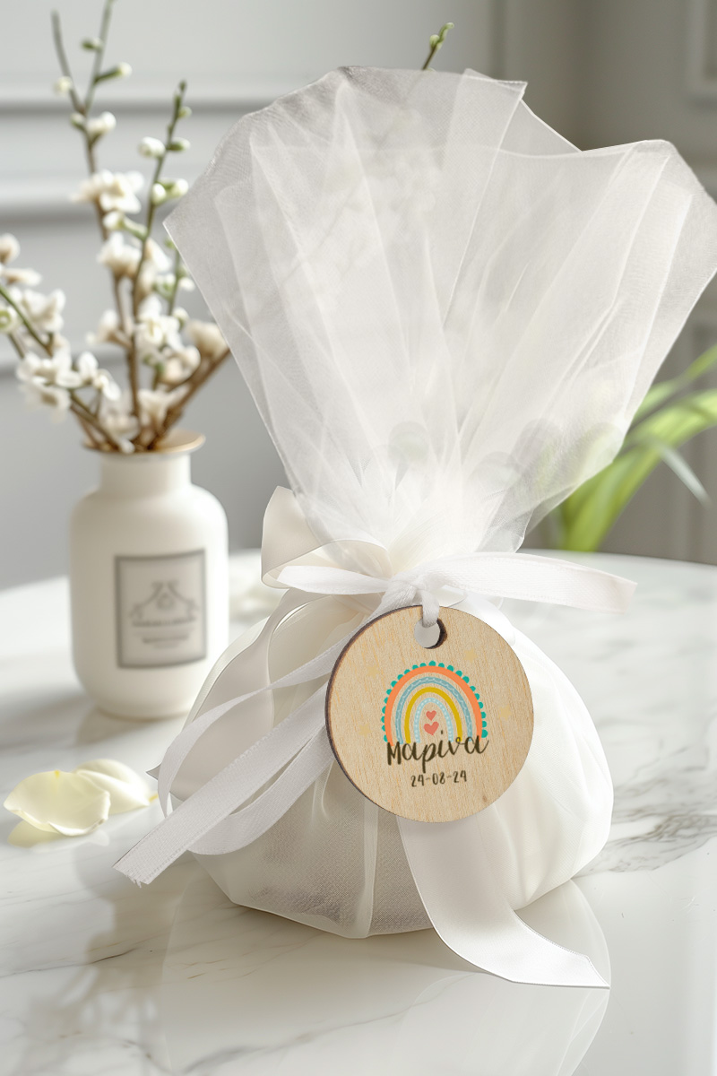 Μοντέρνες & πρωτότυπες μπομπονιέρες βάπτισης με τούλι & κρεμαστό σχέδιο| Σετ εξωτερικό τούλι, Εσωτερικό τούλι, Κορδέλα σατέν & Κρεμαστό σχέδιο σε premium χαρτί, ξύλο ή plexiglass | Premium ποιότητα