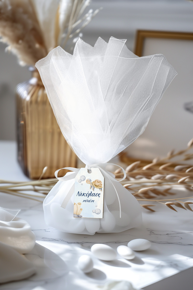 0.59€ – 1.49€Μοντέρνες & πρωτότυπες μπομπονιέρες βάπτισης με τούλι & κρεμαστό σχέδιο | Σετ εξωτερικό τούλι, Εσωτερικό τούλι, Κορδέλα σατέν & Κρεμαστό σχέδιο σε premium χαρτί, ξύλο ή plexiglass | Premium ποιότητα