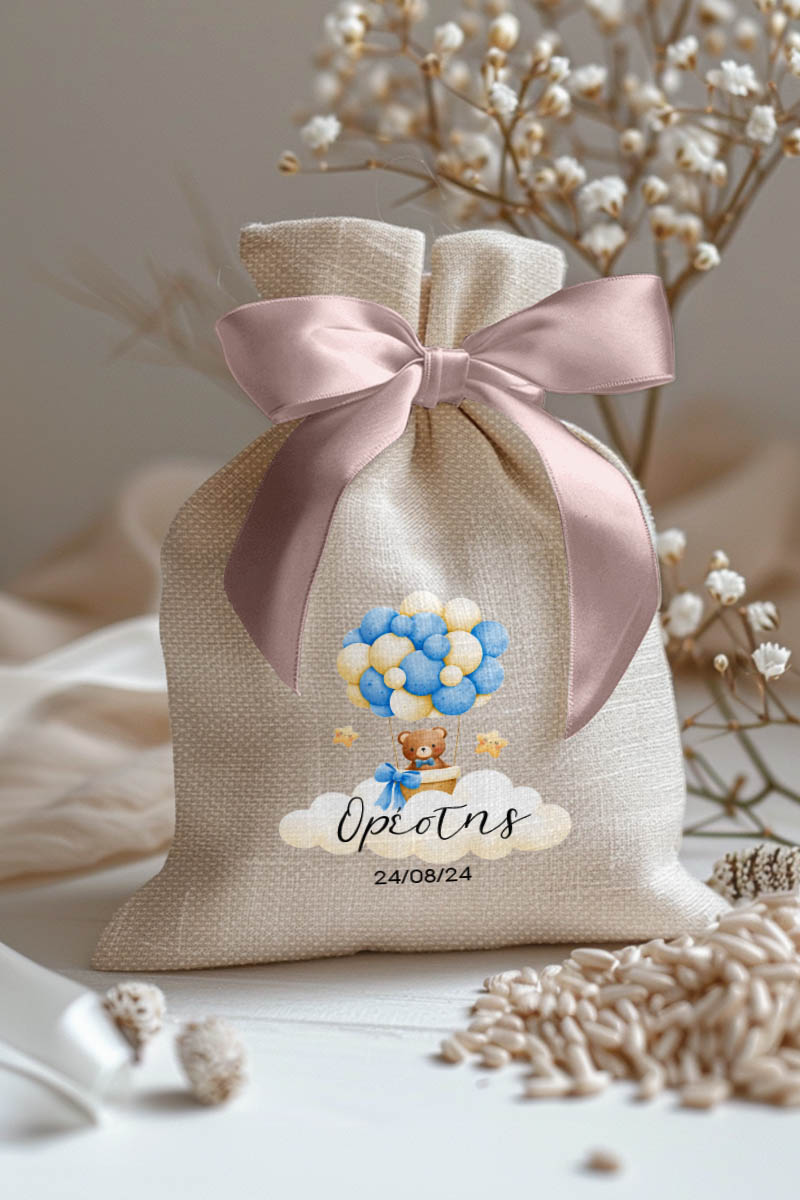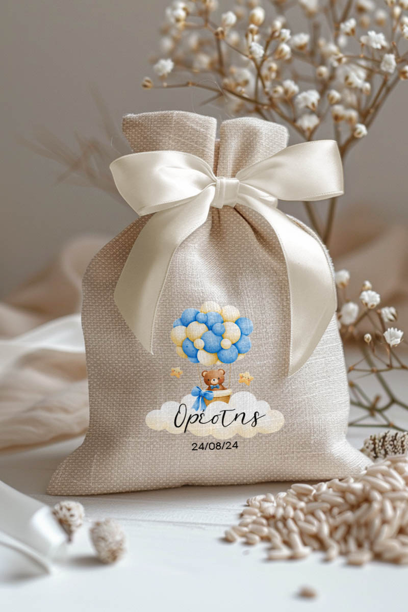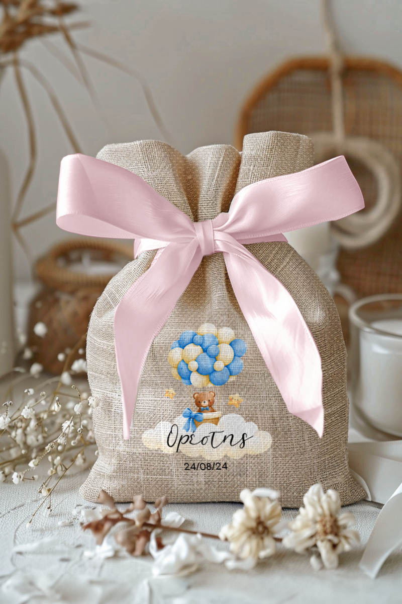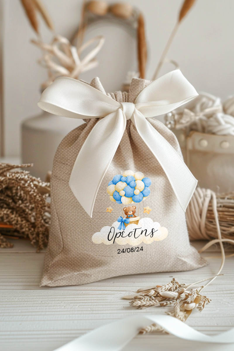 Μπομπονιέρες Βάπτισης με Πουγκί από Καμβά σε Εκρού Χρώμα με σχέδιο Αρκουδάκι στα Σύννεφα