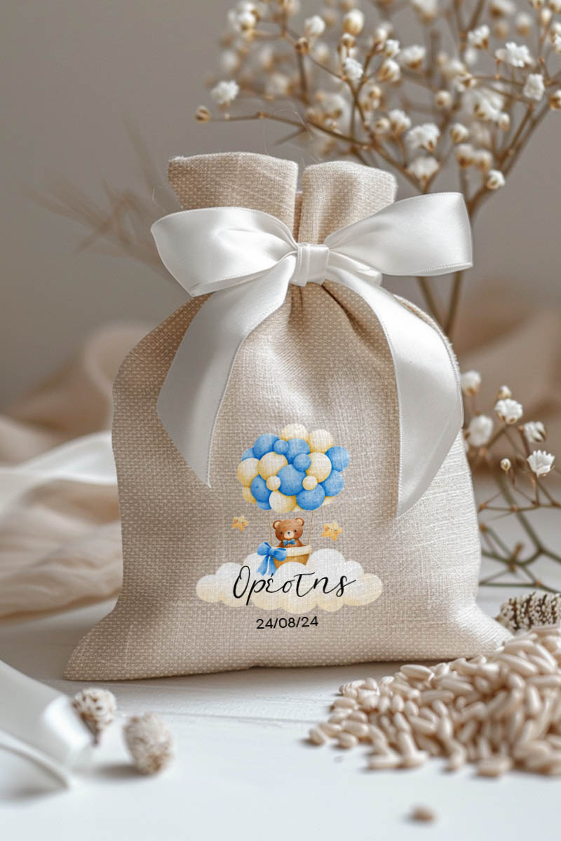 • Κάθε σετ μπομπονιέρας περιλαμβάνει ένα προσωποποιημένο πουγκί από ύφανση καμβά, με δυνατότητα επιλογής χρώματος και σχεδίου.