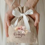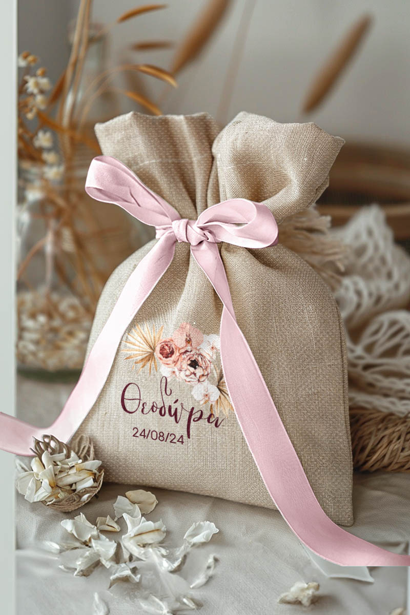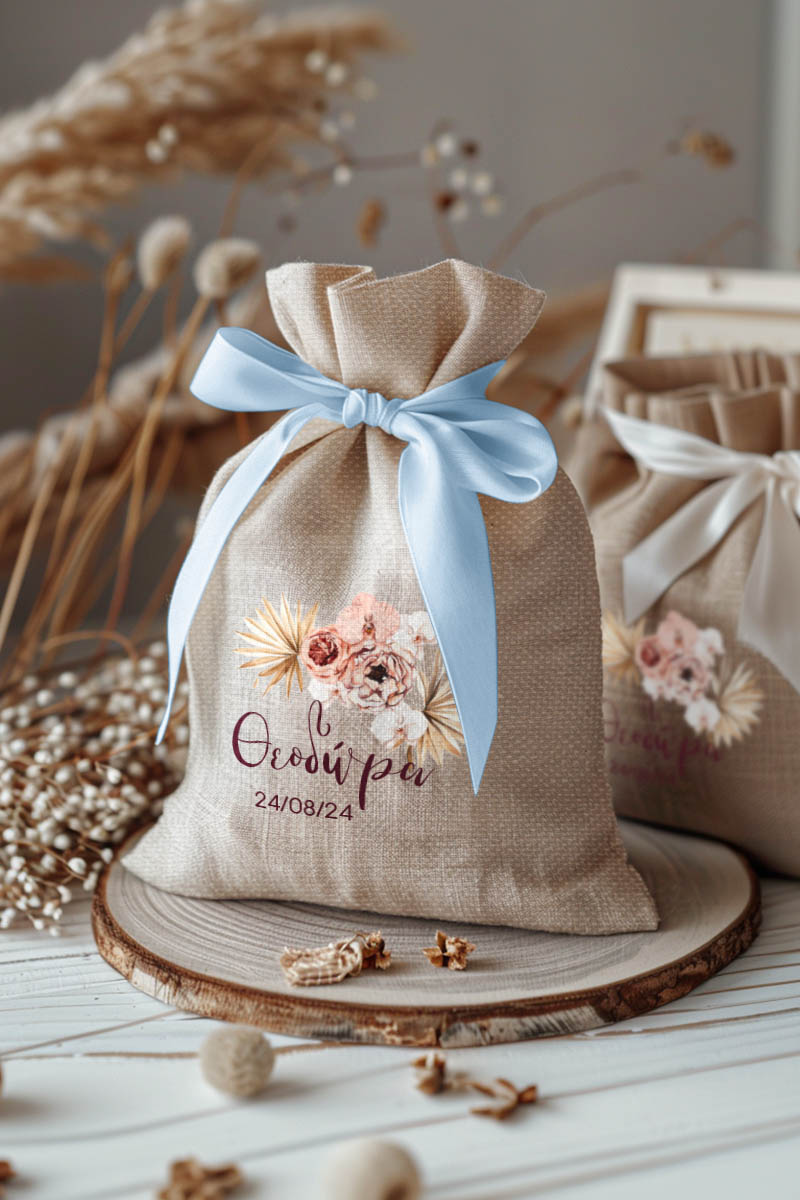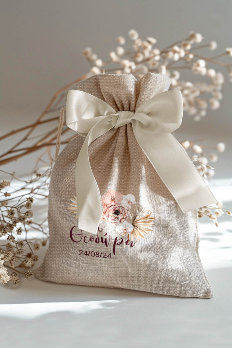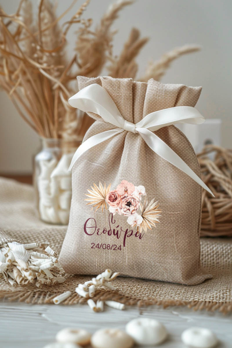 • Κάθε σετ μπομπονιέρας περιλαμβάνει ένα προσωποποιημένο πουγκί από ύφανση καμβά, με δυνατότητα επιλογής χρώματος και σχεδίου.