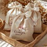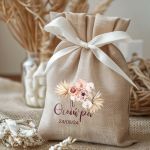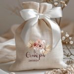 Μπομπονιέρες Βάπτισης με Πουγκί από Καμβά σε Εκρού Χρώμα με σχέδιο Boho Μπεζ Λουλούδια