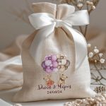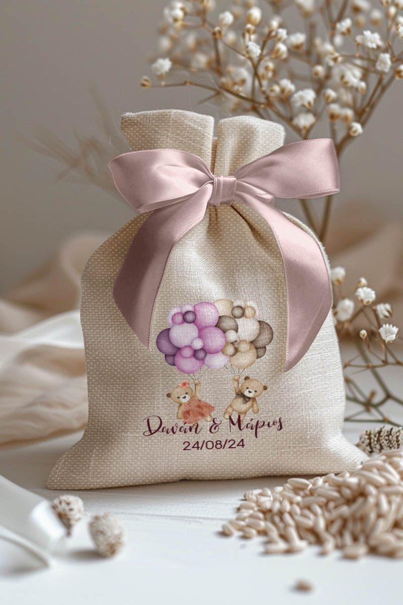Μπομπονιέρες Βάπτισης με Πουγκί από Καμβά σε Εκρού Χρώμα με σχέδιο Δίδυμα Αρκουδάκια Μπαλόνια