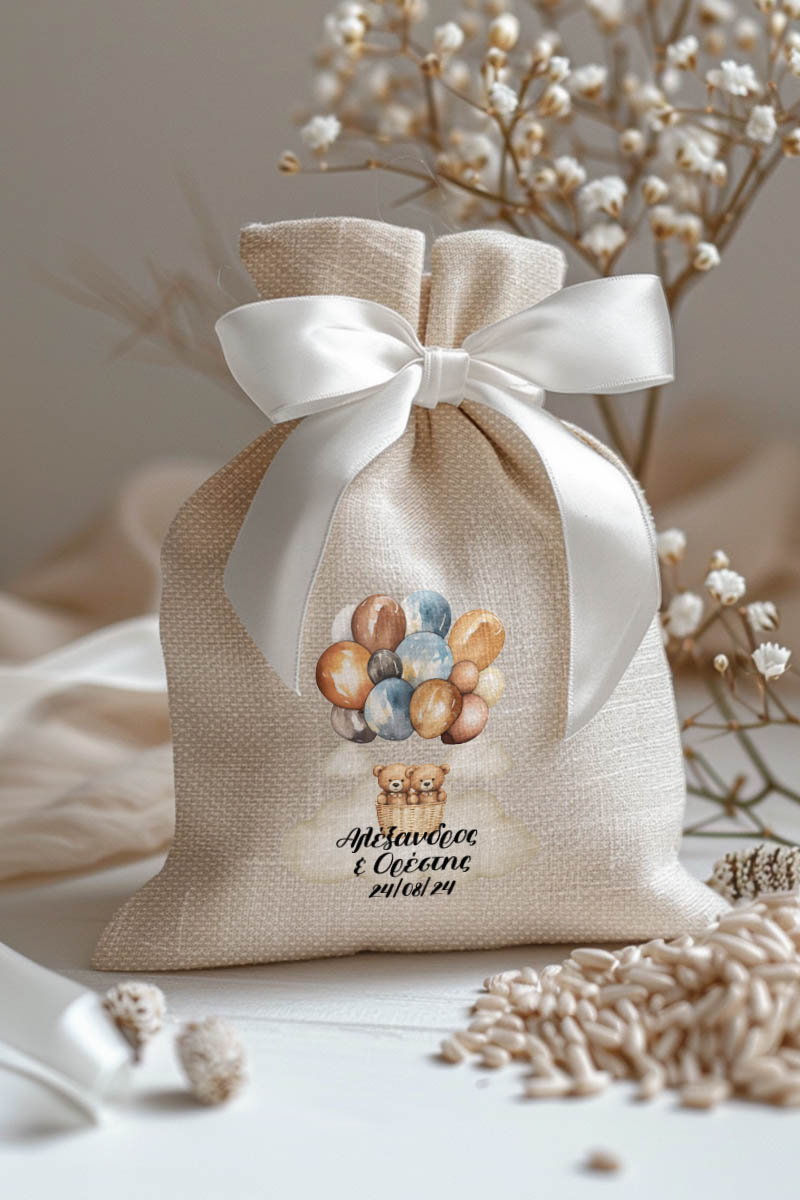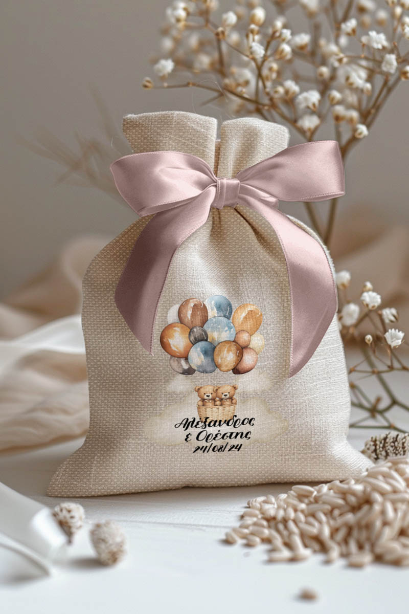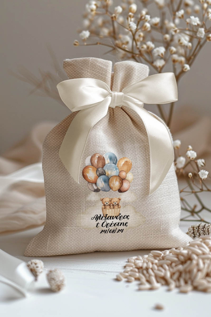 • Κάθε σετ μπομπονιέρας περιλαμβάνει ένα προσωποποιημένο πουγκί από ύφανση καμβά, με δυνατότητα επιλογής χρώματος και σχεδίου.