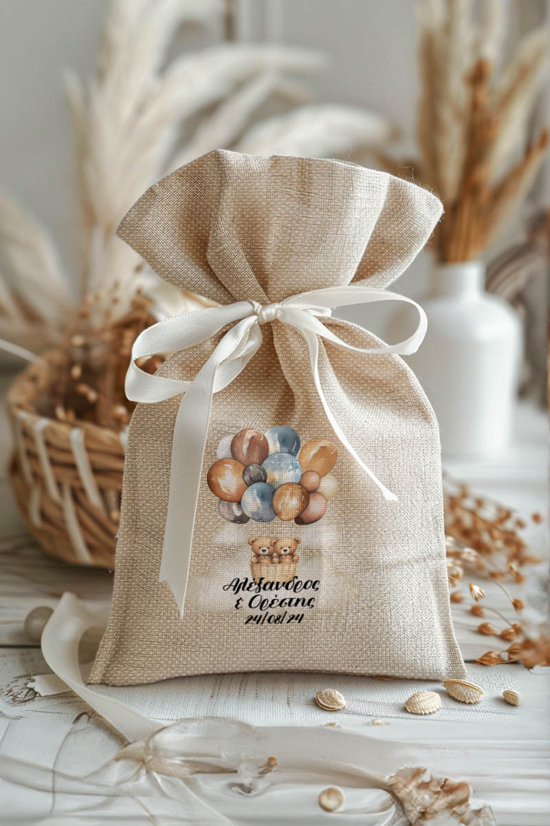 Μπομπονιέρες Βάπτισης με Πουγκί από Καμβά σε Εκρού Χρώμα με σχέδιο Δίδυμα Αρκουδάκια