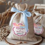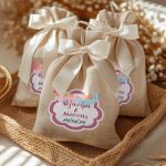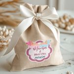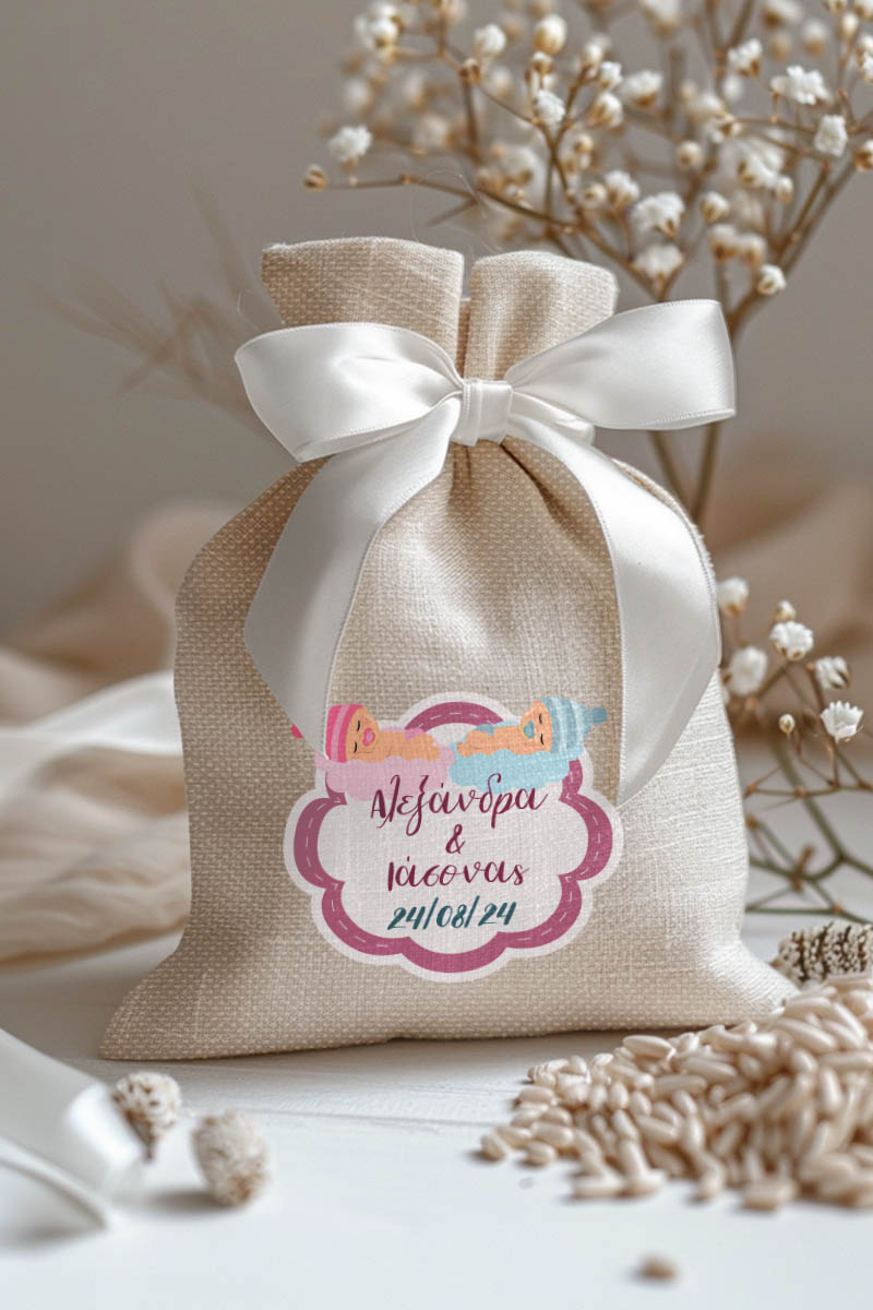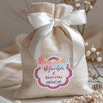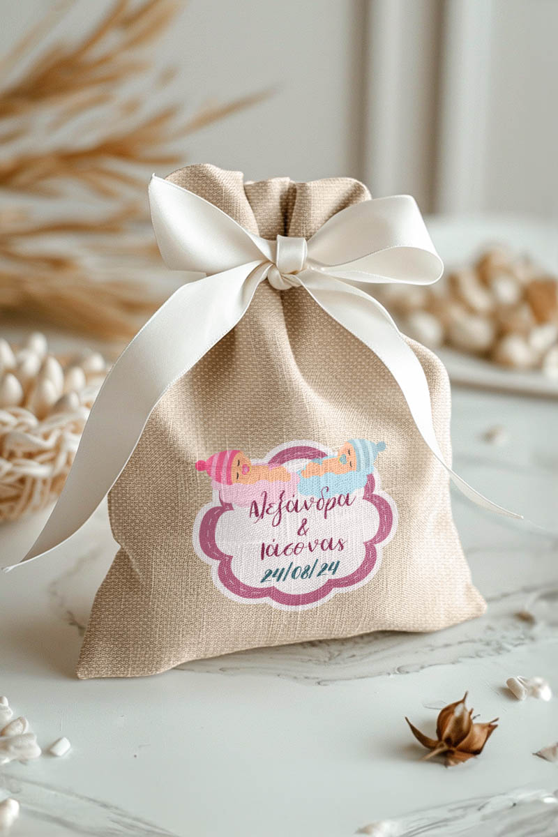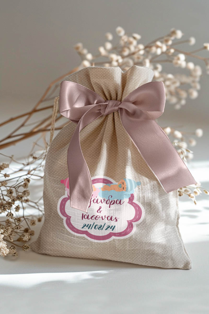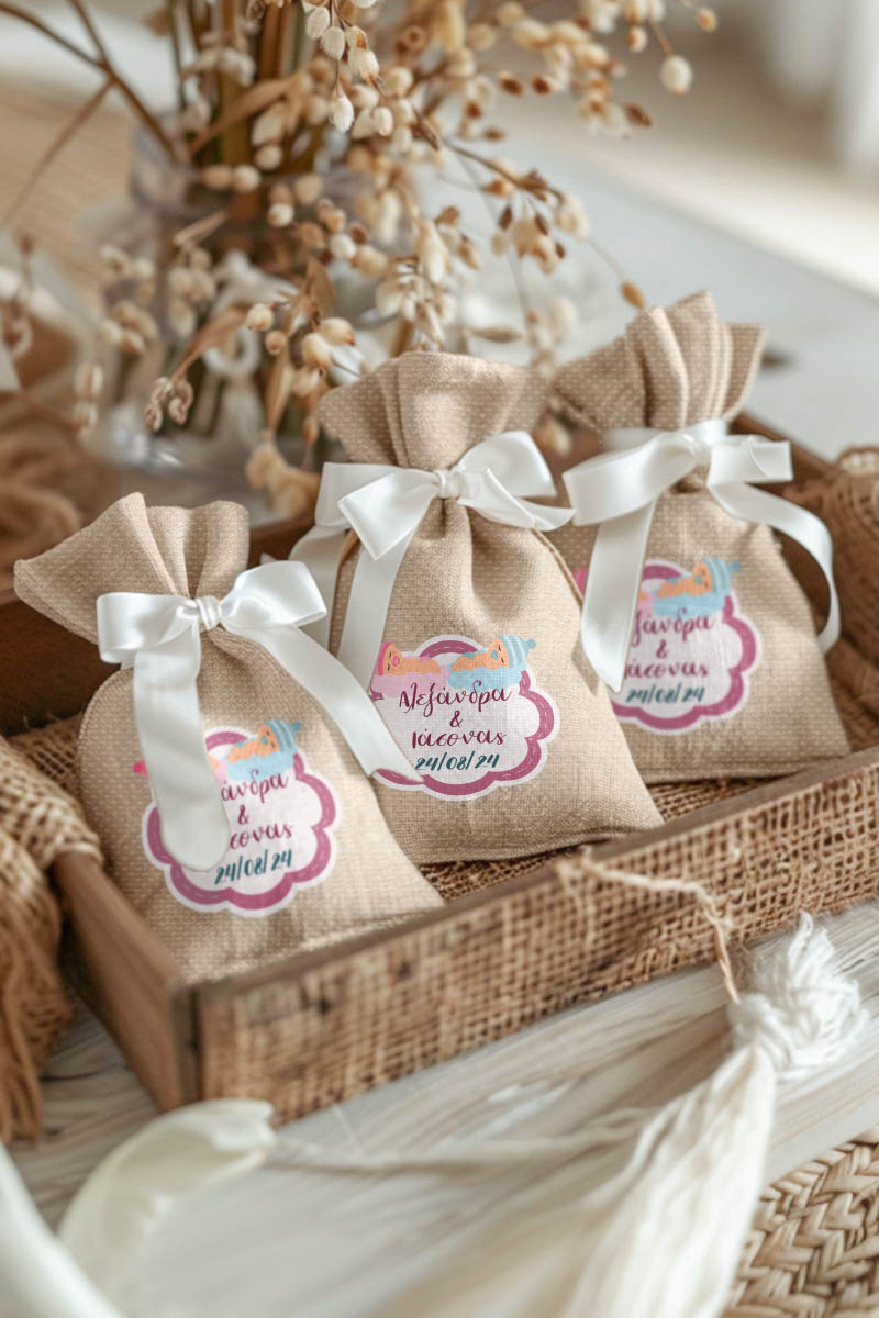• Κάθε σετ μπομπονιέρας περιλαμβάνει ένα προσωποποιημένο πουγκί από ύφανση καμβά, με δυνατότητα επιλογής χρώματος και σχεδίου.