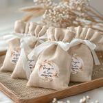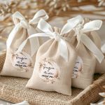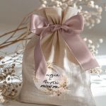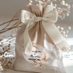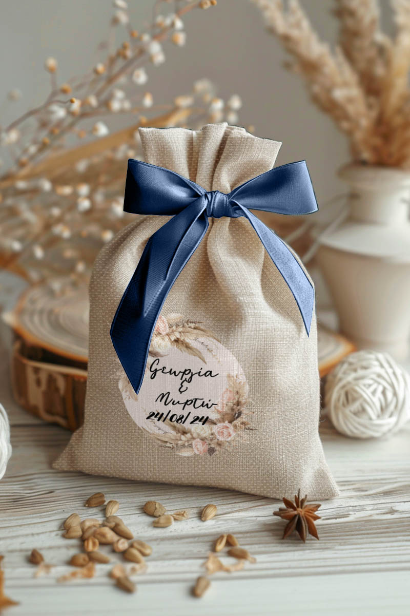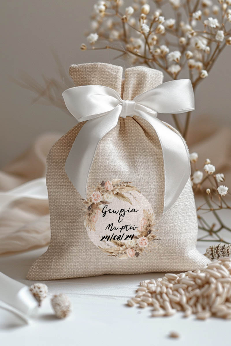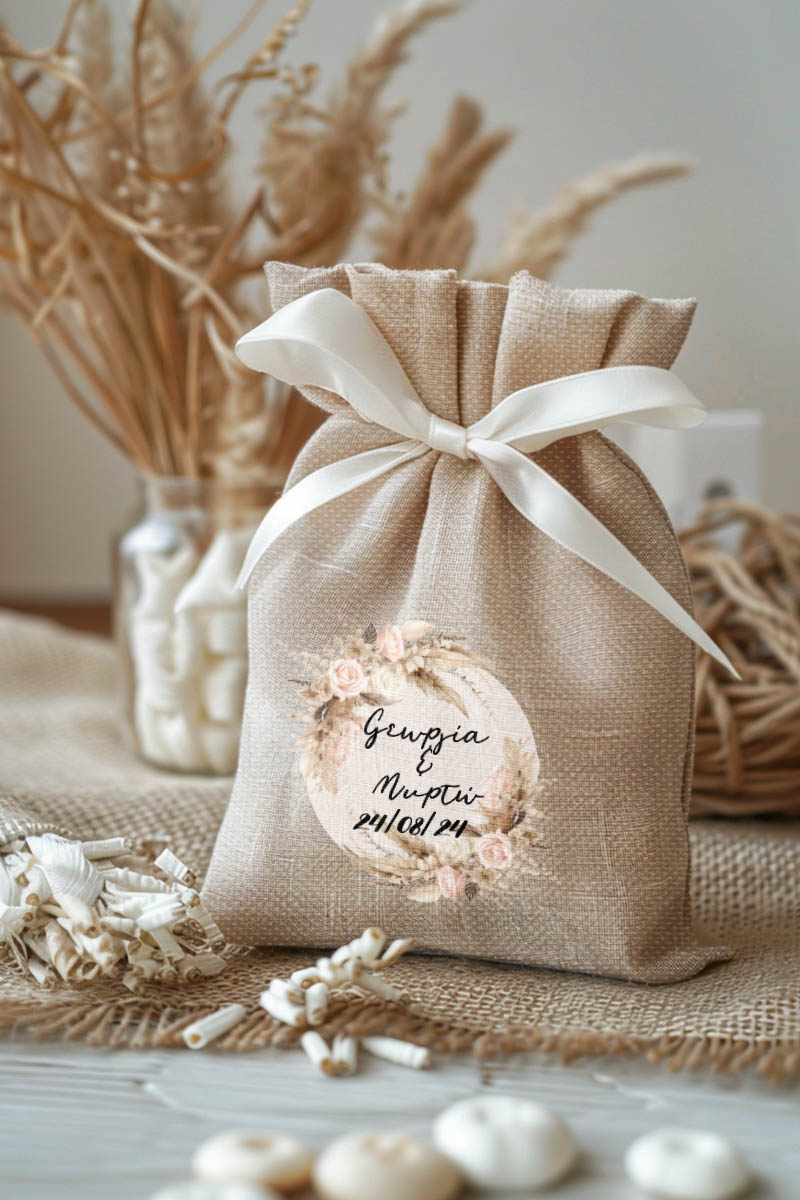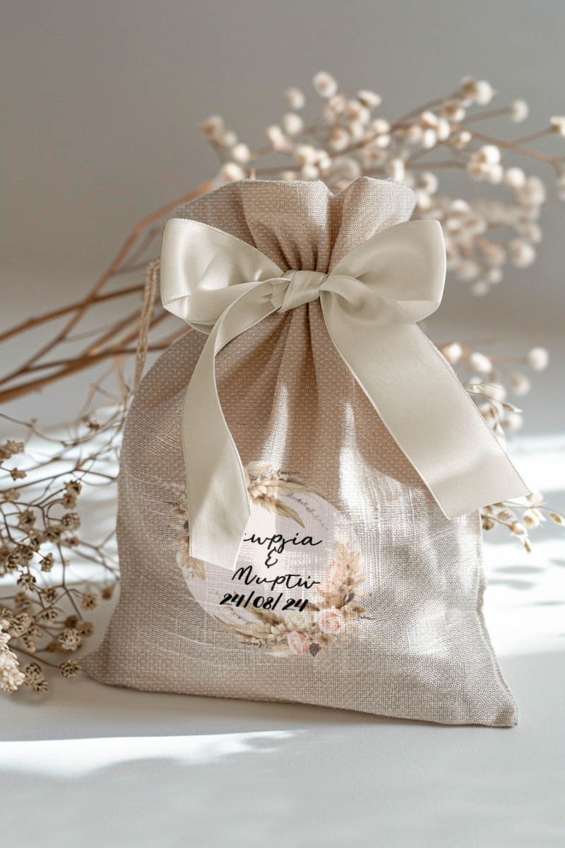 • Κάθε σετ μπομπονιέρας περιλαμβάνει ένα προσωποποιημένο πουγκί από ύφανση καμβά, με δυνατότητα επιλογής χρώματος και σχεδίου.