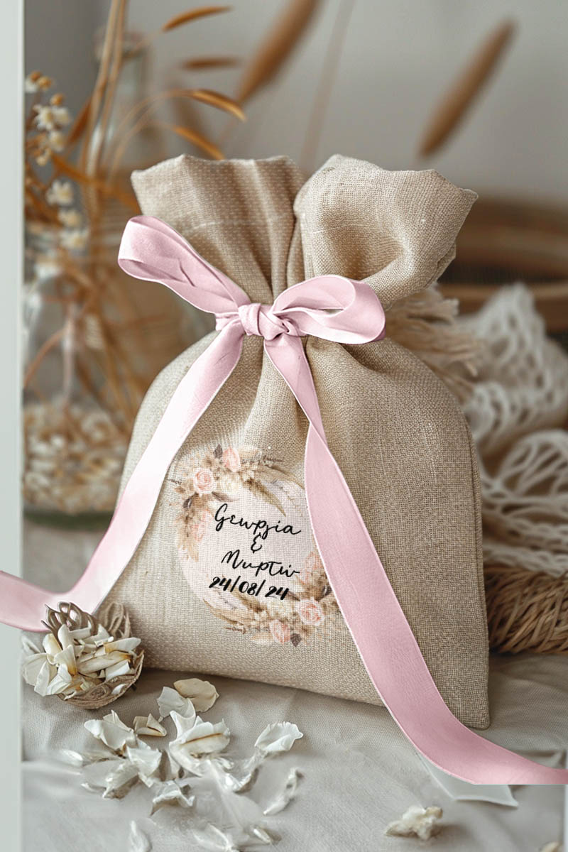 Μπομπονιέρες Βάπτισης με Πουγκί από Καμβά σε Εκρού Χρώμα με σχέδιο Δίδυμες Boho Ανθοδέσμες
