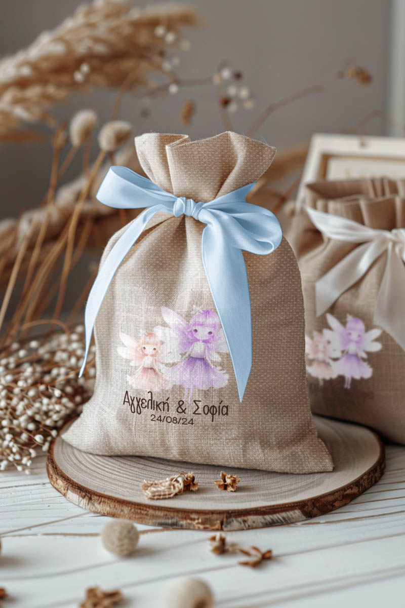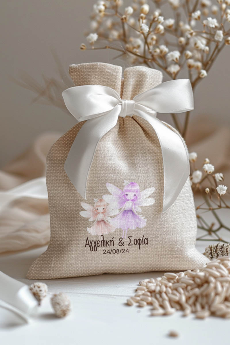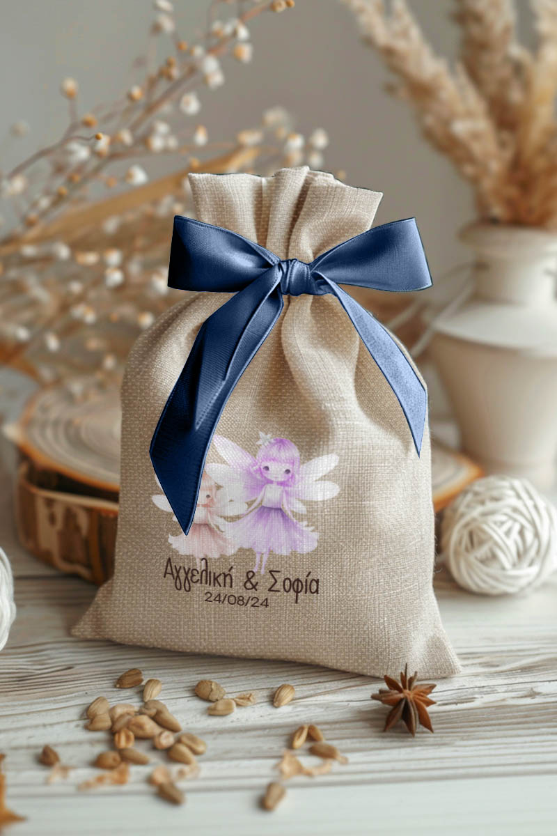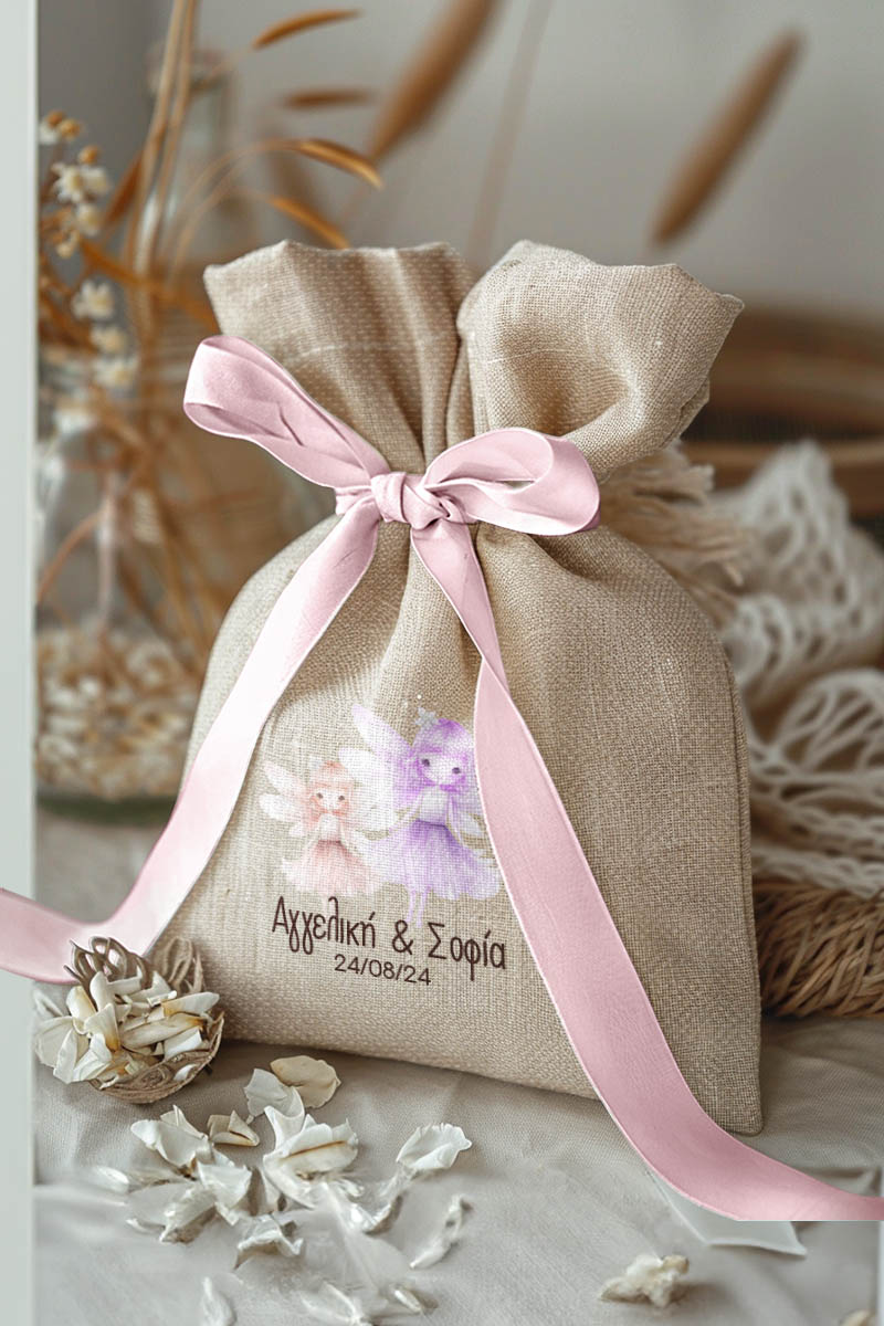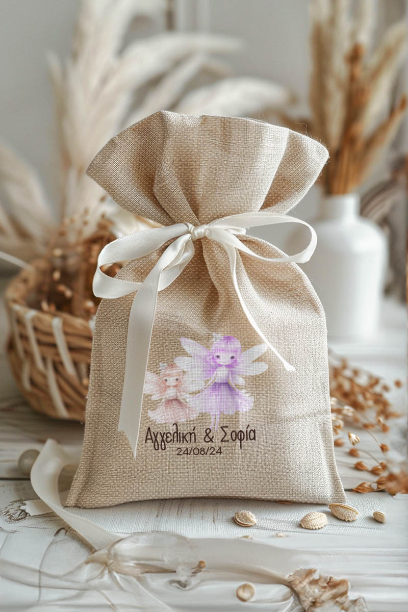 Μπομπονιέρες Βάπτισης με Πουγκί από Καμβά σε Εκρού Χρώμα με σχέδιο Δίδυμες Νεράιδες