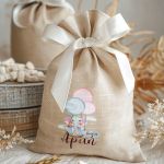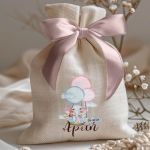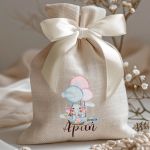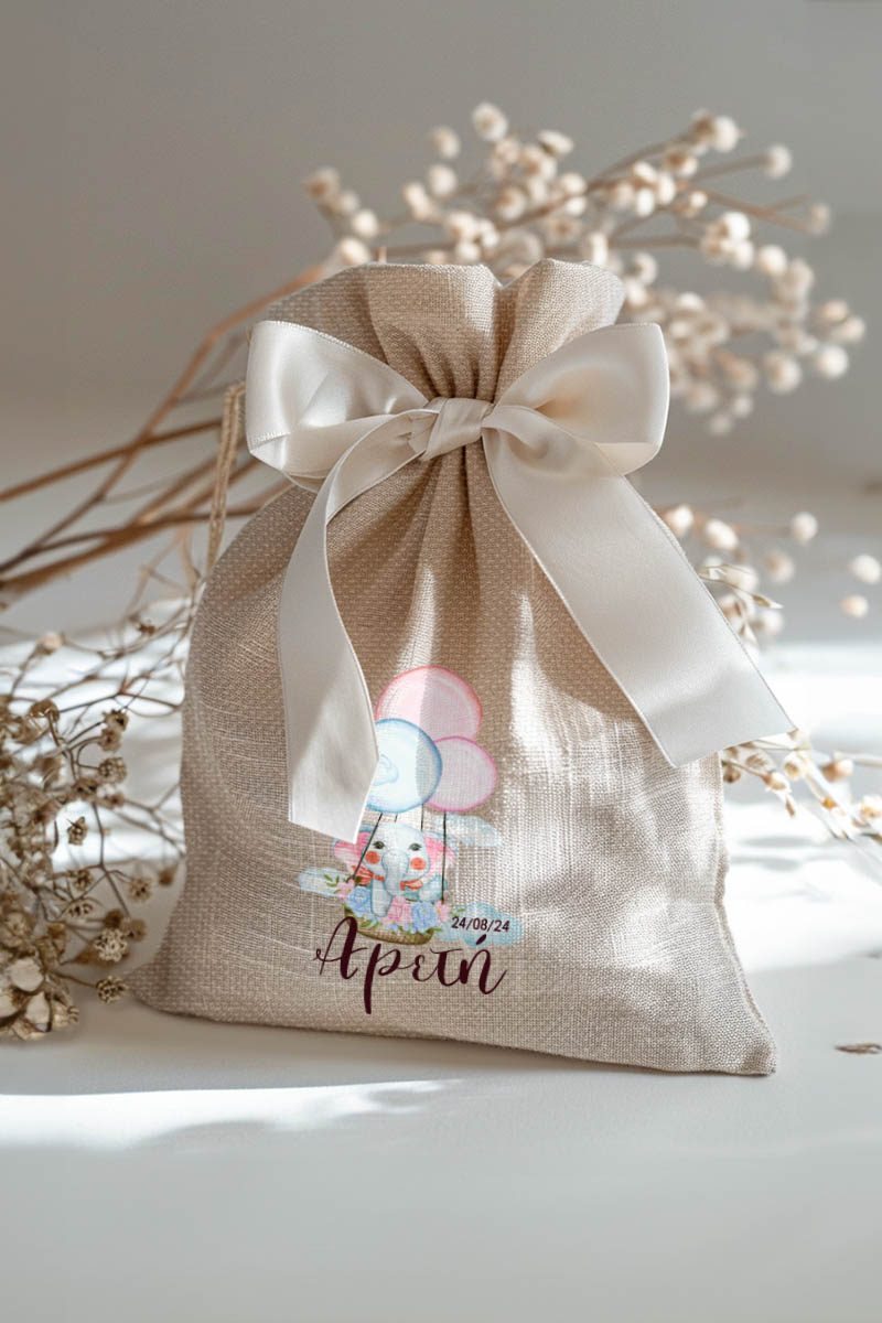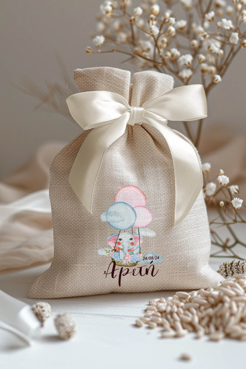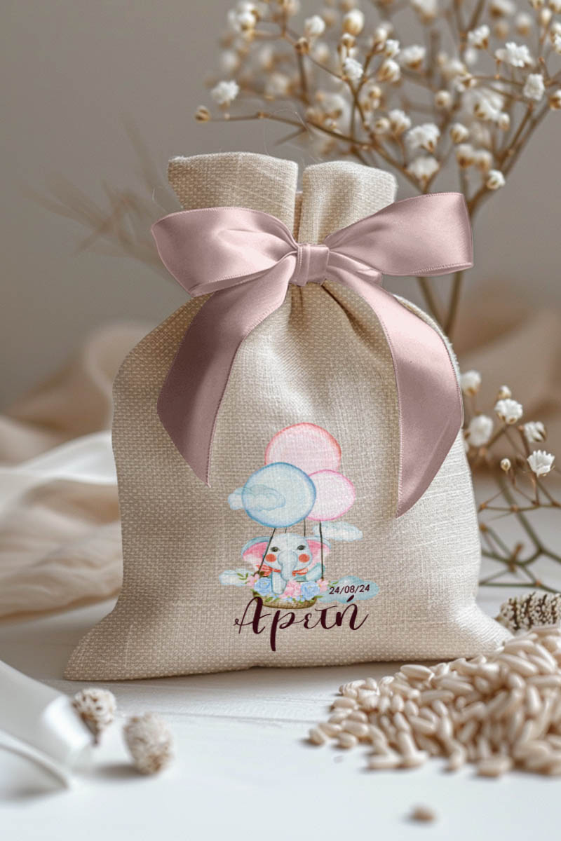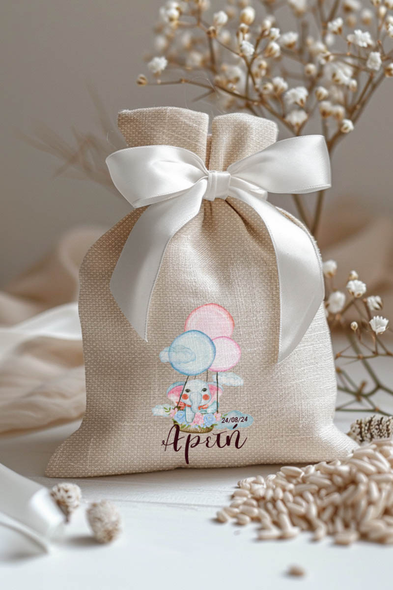 Μπομπονιέρες Βάπτισης με Πουγκί από Καμβά σε Εκρού Χρώμα με σχέδιο Ελεφαντάκι με Μπαλόνια