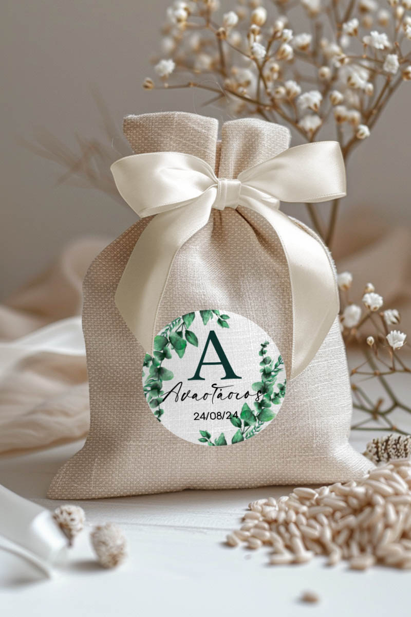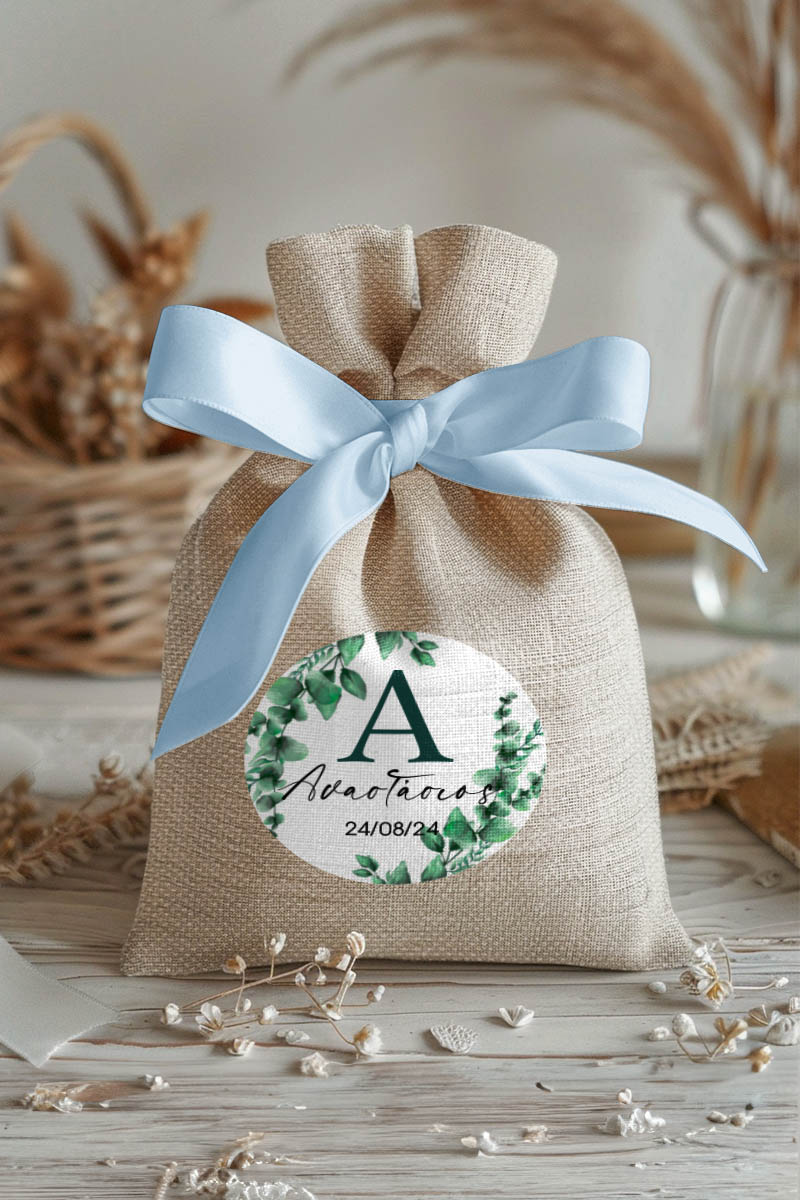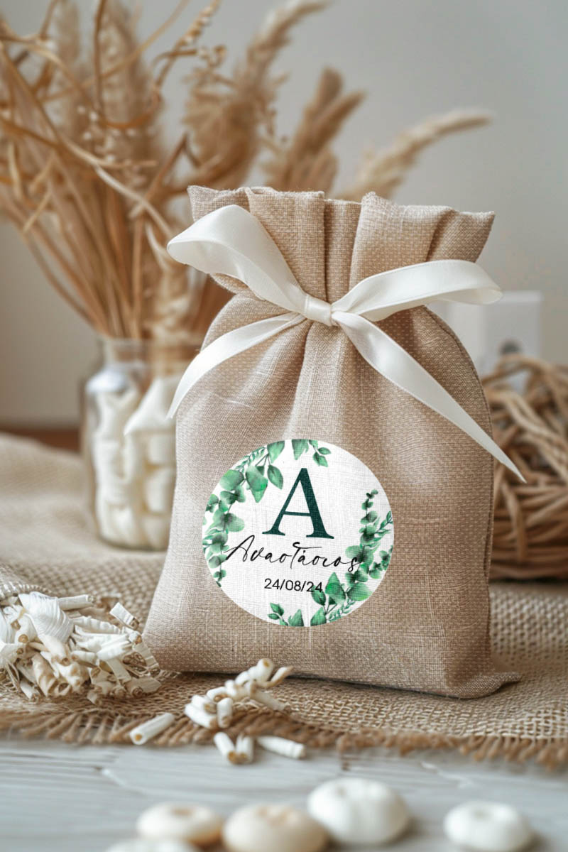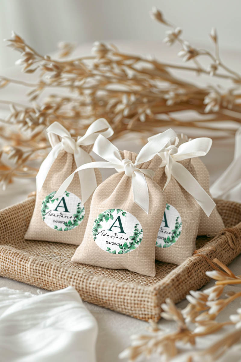 - Κάθε σετ μπομπονιέρας περιλαμβάνει ένα προσωποποιημένο πουγκί από ύφανση καμβά, με δυνατότητα επιλογής χρώματος και σχεδίου.