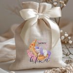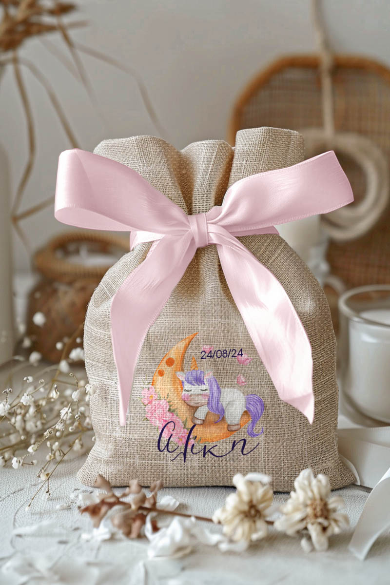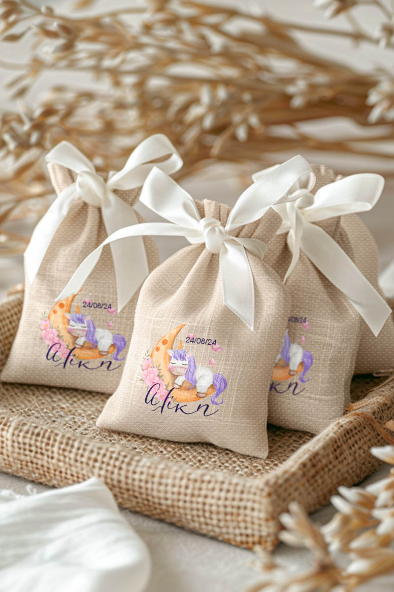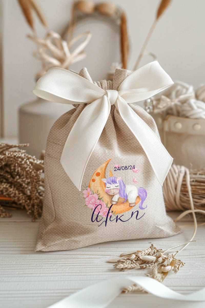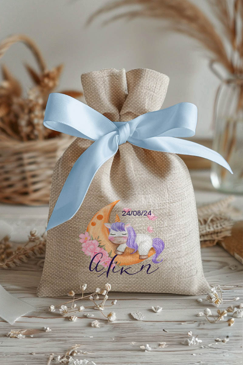 Μπομπονιέρες Βάπτισης με Πουγκί από Καμβά σε Εκρού Χρώμα με σχέδιο Μονόκερος στο Φεγγάρι