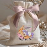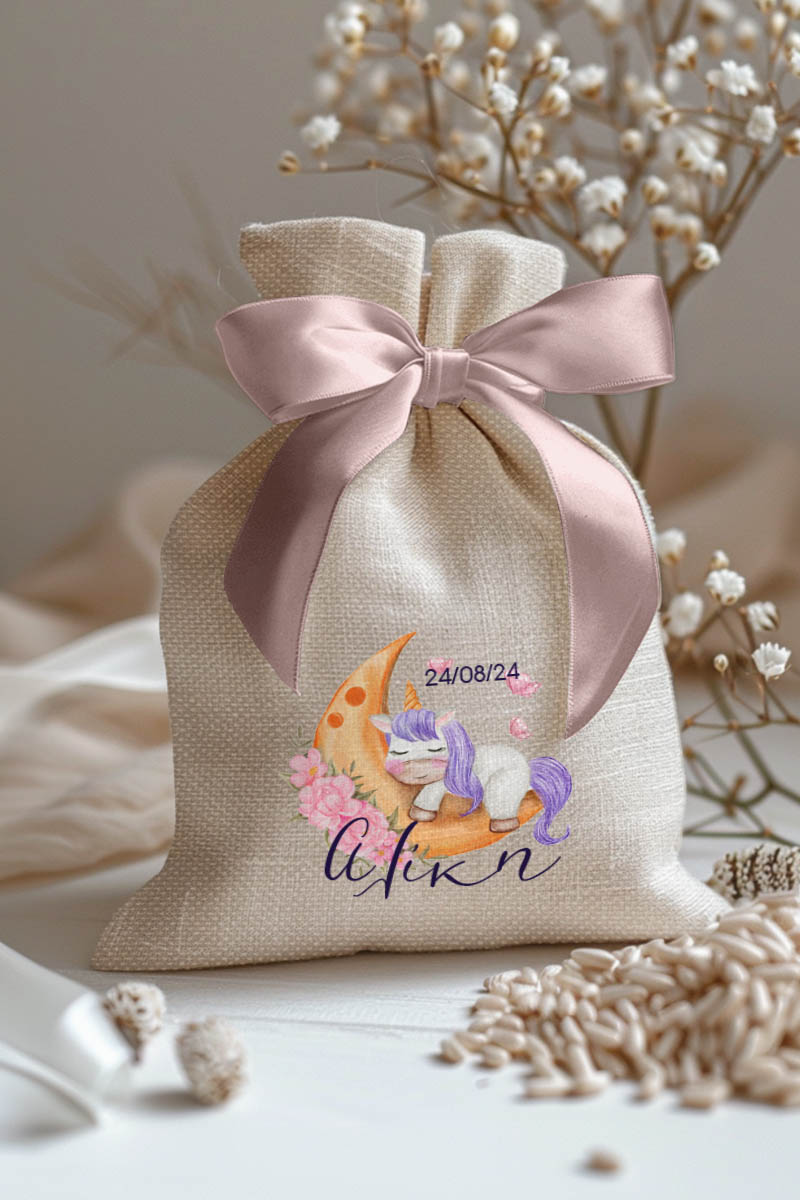 Μπομπονιέρες Βάπτισης Πουγκί σε Εκρού Χρώμα με Σχέδιο Μονόκερος στο Φεγγάρι