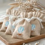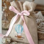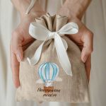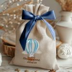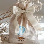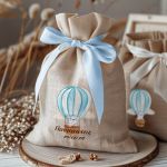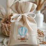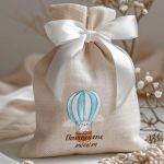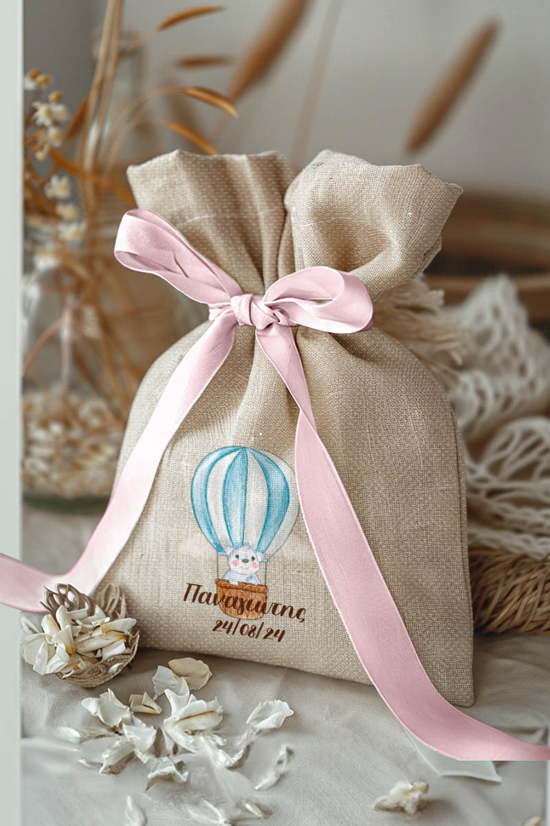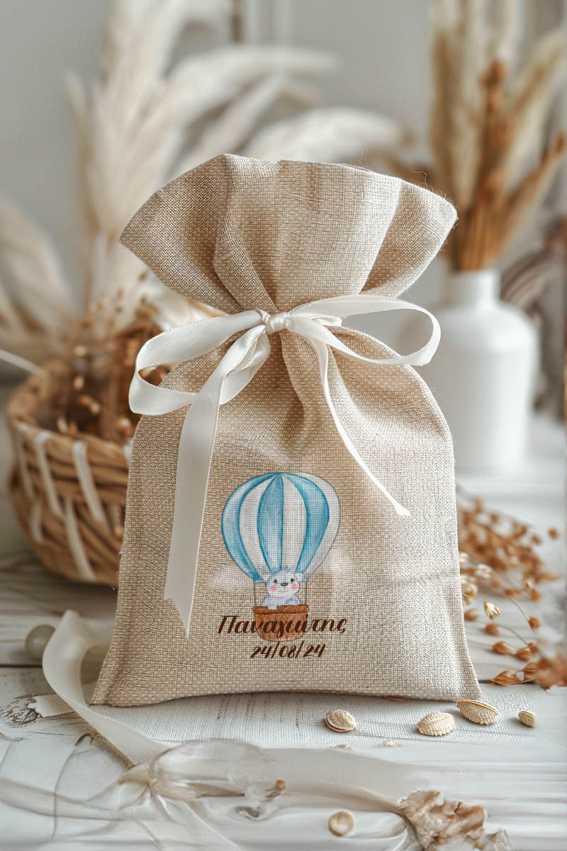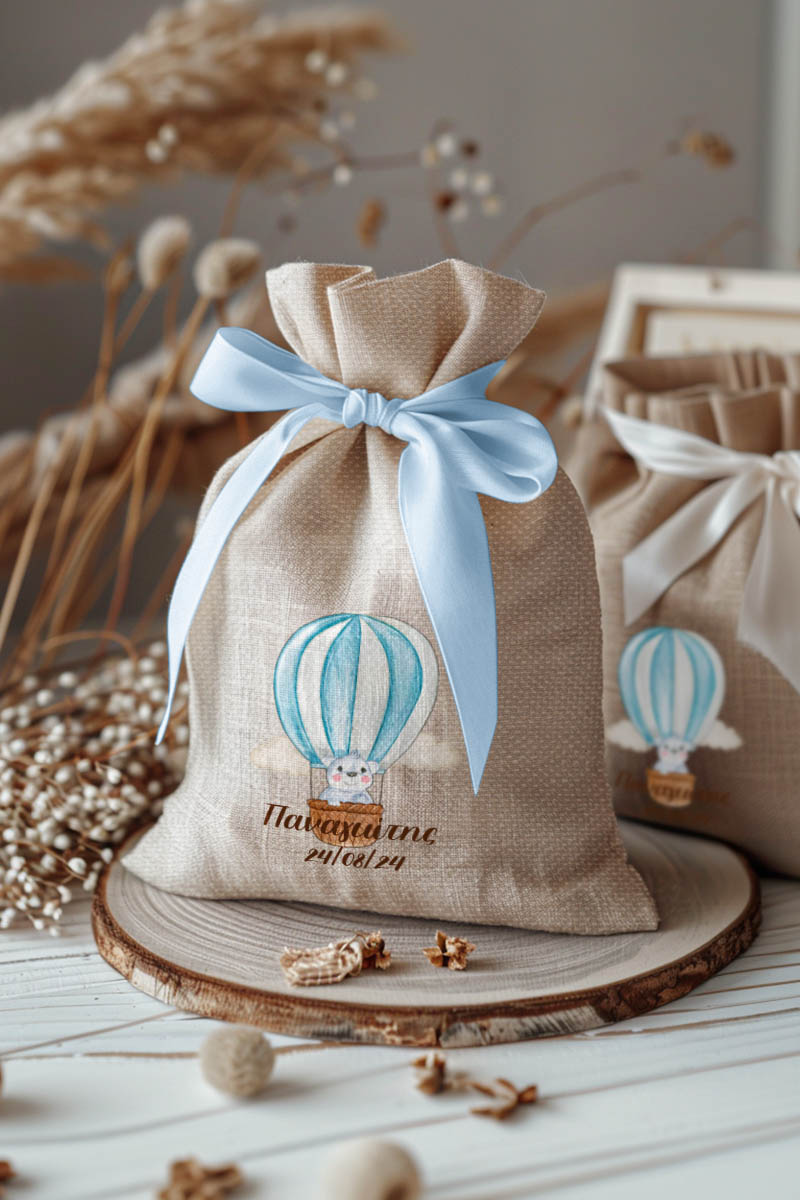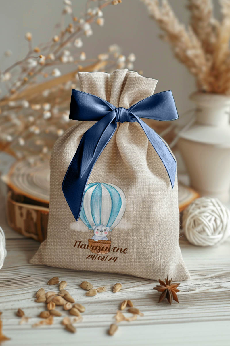 Μπομπονιέρες Βάπτισης με Πουγκί από Καμβά σε Εκρού Χρώμα με σχέδιο Μπλε Αερόστατο